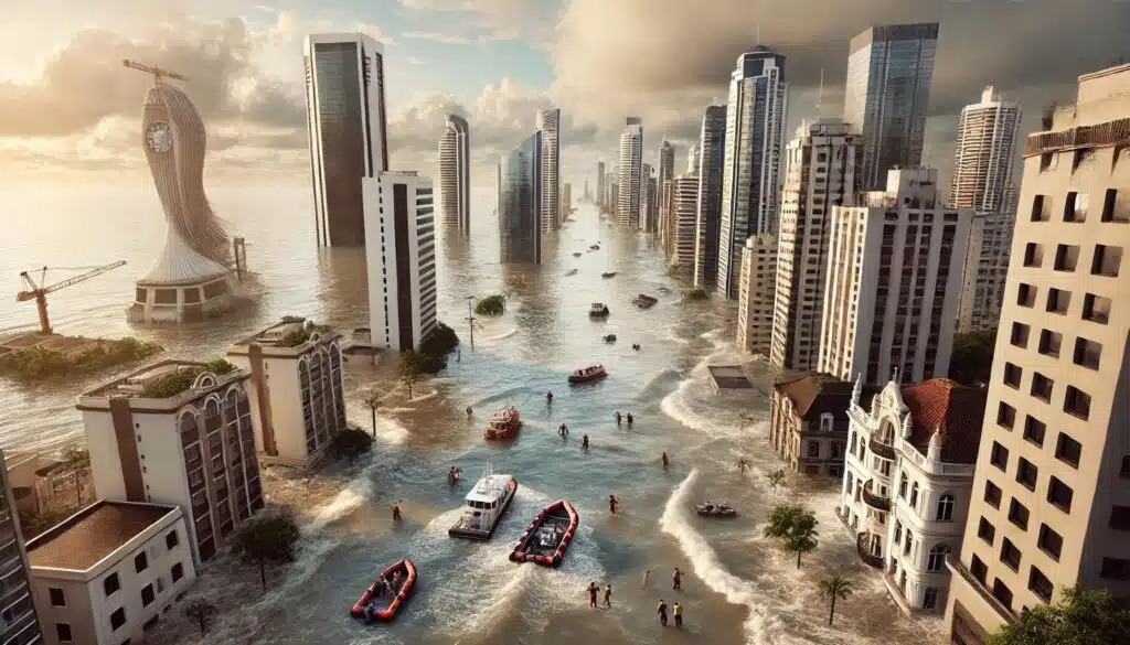 Une ville côtière partiellement submergée par la montée des eaux. Les gratte-ciels ont de l’eau jusqu’aux étages inférieurs, des bateaux naviguent entre les bâtiments, et les services de secours sauvent les gens. Le ciel est nuageux et l’eau semble agitée, indiquant une tempête récente.