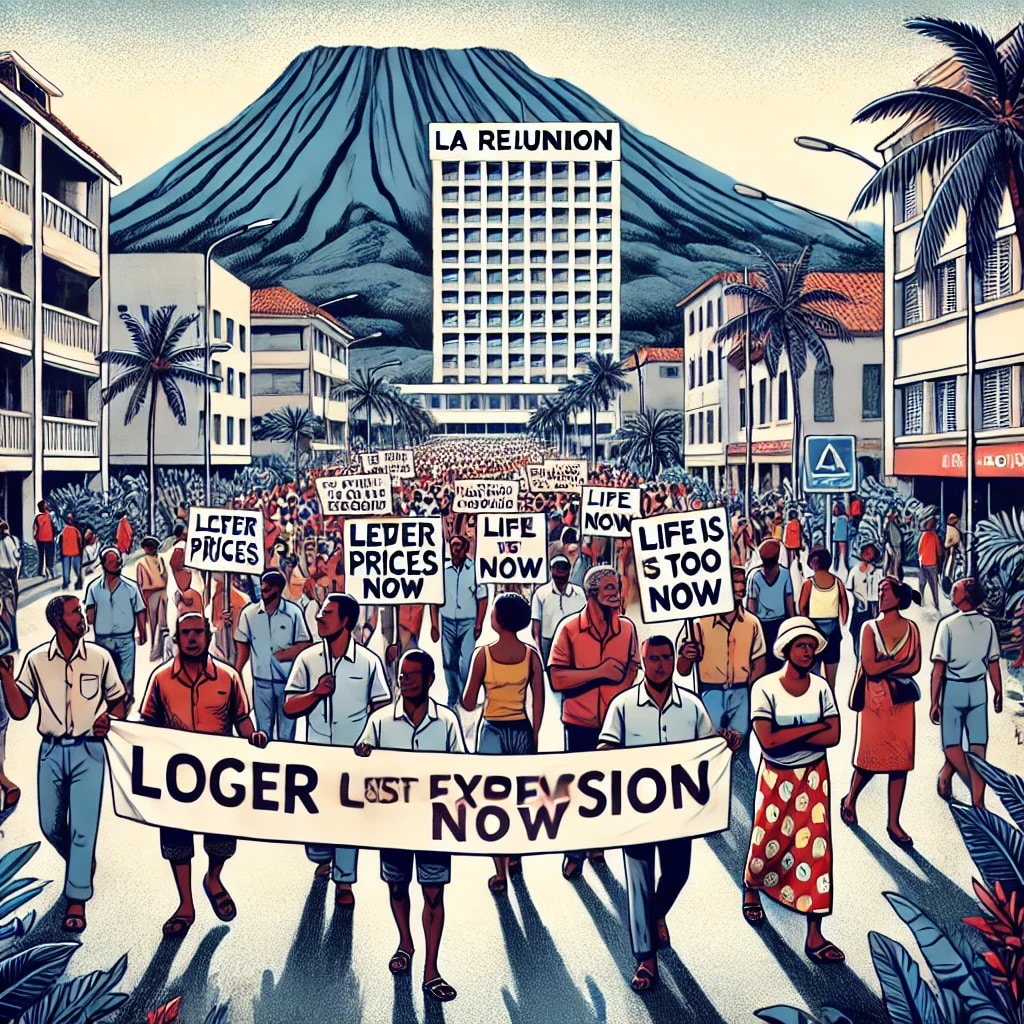 Voici l’illustration d’une manifestation à La Réunion contre la vie chère. On y voit des citoyens de divers horizons tenant des pancartes avec des slogans comme « Baissez les prix maintenant » et « La vie est trop chère », dans un cadre typiquement réunionnais avec des palmiers et des montagnes volcaniques en arrière-plan. L’atmosphère est paisible mais déterminée.