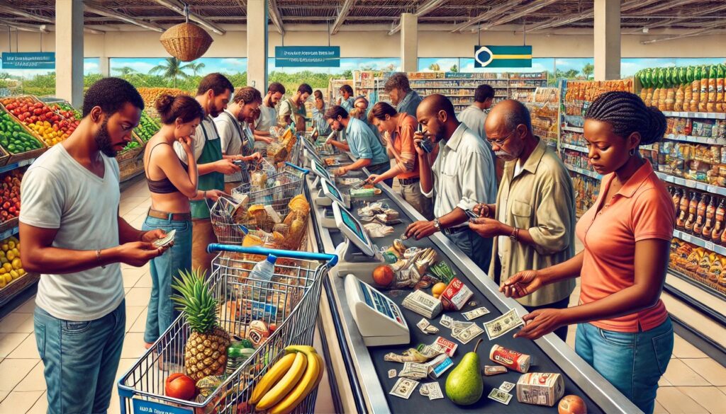 La scène montre divers acheteurs, certains ayant l’air frustrés ou inquiets alors qu’ils vérifient leur portefeuille presque vide, tandis que d’autres essaient d’acheter seulement quelques articles essentiels. L’arrière-plan présente des allées de supermarchés remplies de produits et des caissiers en train de traiter les articles. L’ambiance est tendue, reflétant les défis que pose le fait de se procurer les produits de première nécessité.