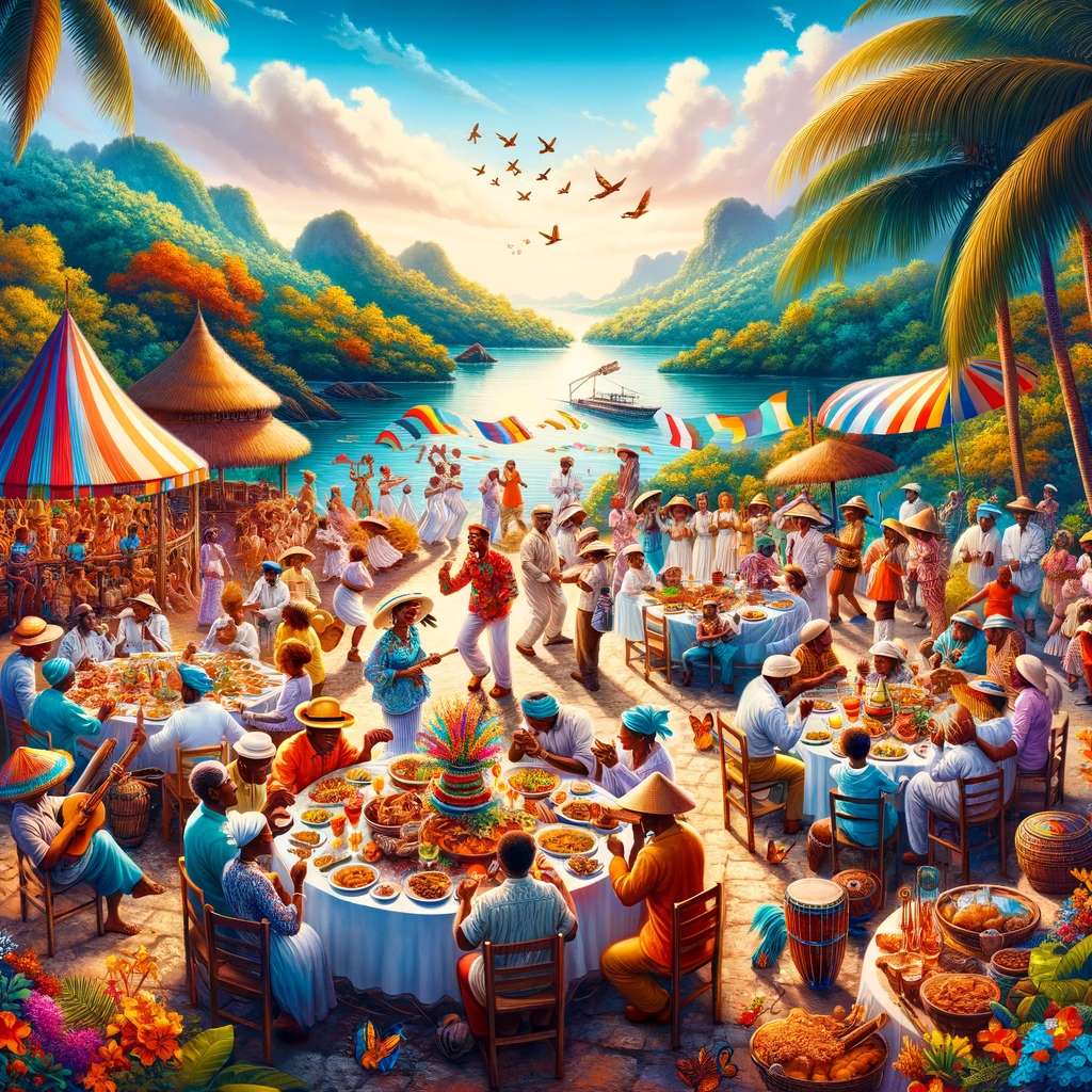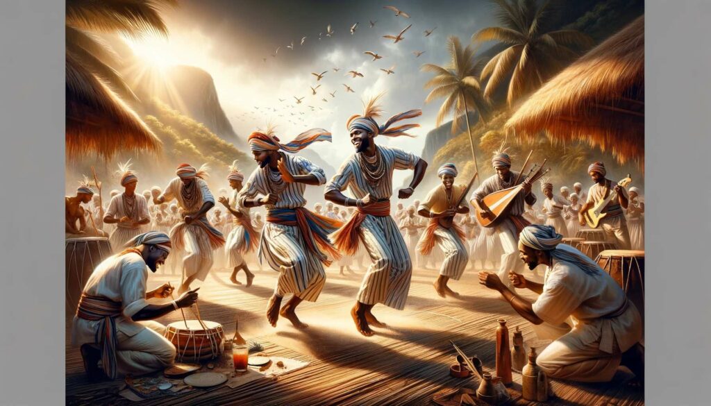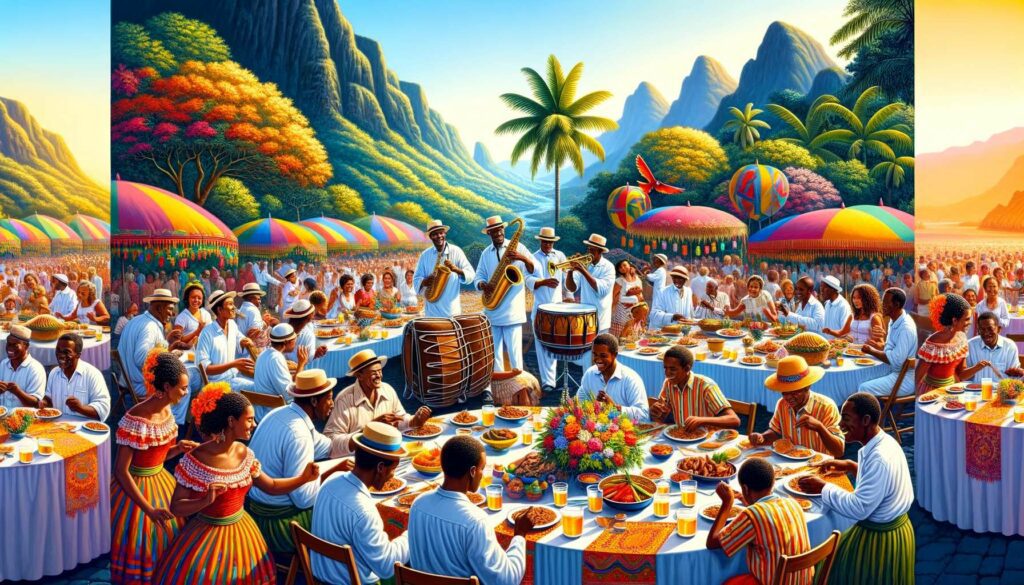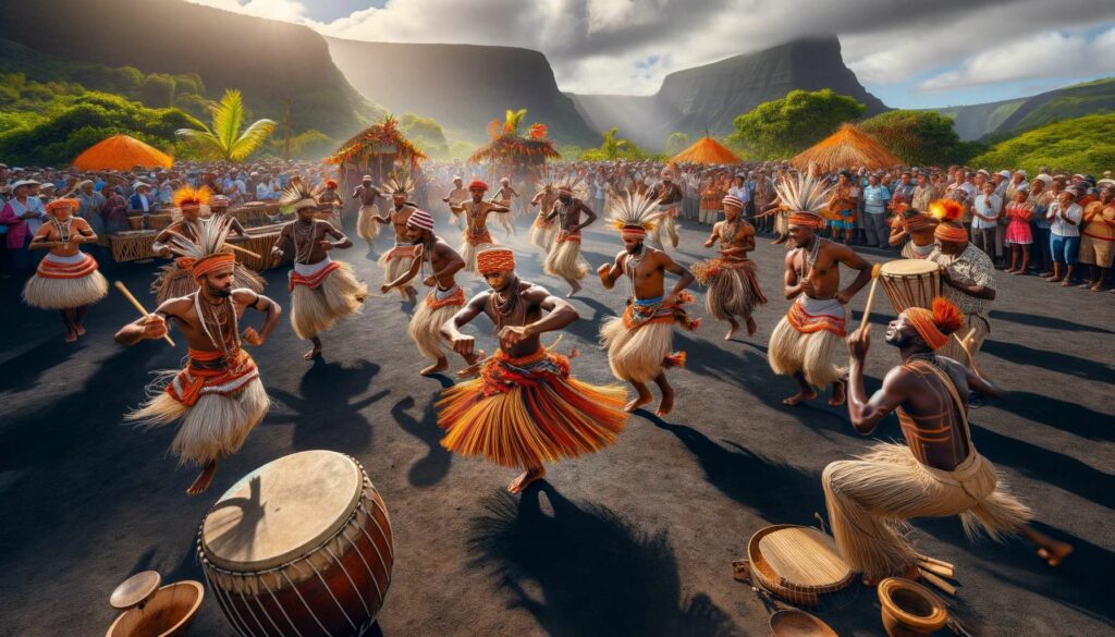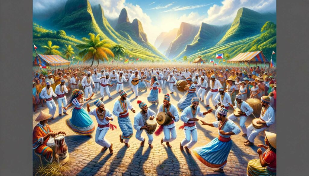 Voici une illustration révisée qui vise à être une représentation plus précise d’une célébration de la Fèt Kaf à La Réunion. Le kayamb et le roulèr sont mis en évidence de manière proéminente, et les danseurs sont vêtus de jupes colorées, pour mieux refléter la tenue authentique associée à cette danse.