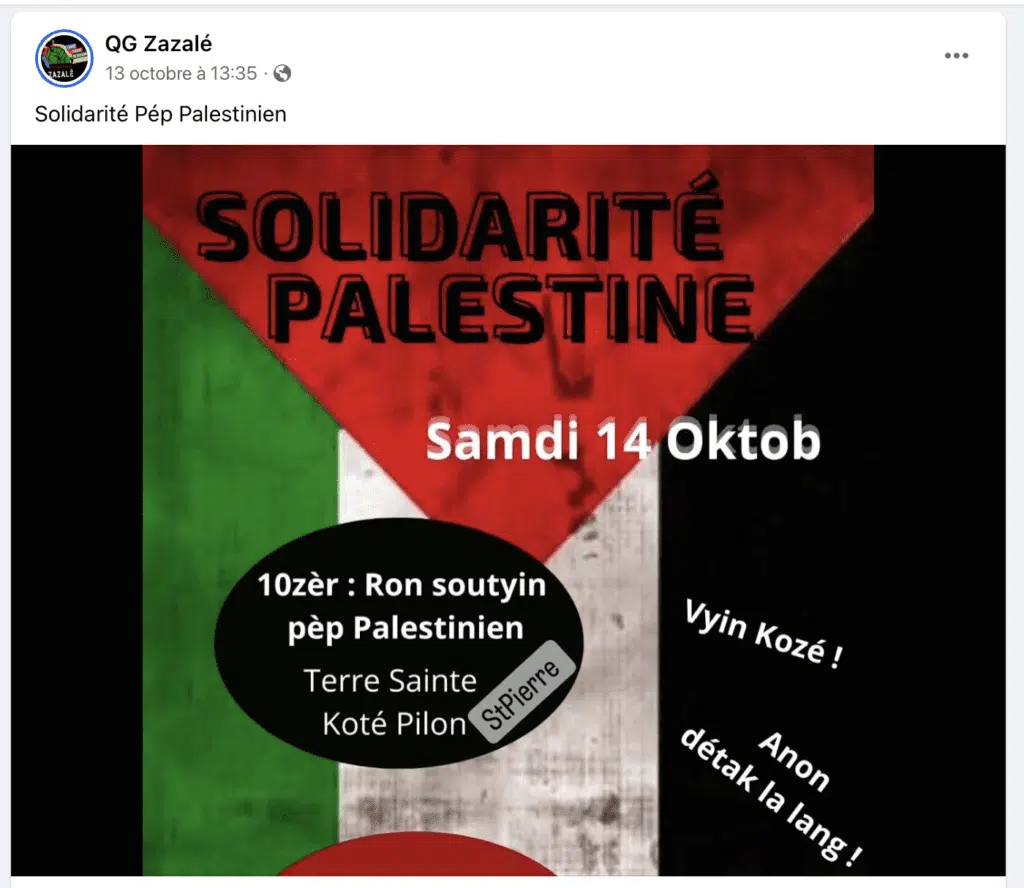 Suit dans l’arrêté préfectoral une citation anti-raciste vue sur la page FB du QG des Zazalés («… mélanz pa ethnie èk idéologie. ») , puis une autre contre la politique coloniale de l’Etat d’Israël (qui peut nier les implantations de colons en Cisjordanie à l’encontre du droit international ?), à quoi M. le préfet et sa directrice de cabinet estiment « que, par conséquent, ce soutien va de pair avec une légitimation des méthodes terroristes que l’association s’efforce de justifier ou de minimiser au motif qu’il s’agit d’une forme de résistance nécessaire ; » Encore une fois, il n’y a de « par conséquent » que dans l’imagination de celui qui voudrait justifier une interdiction.