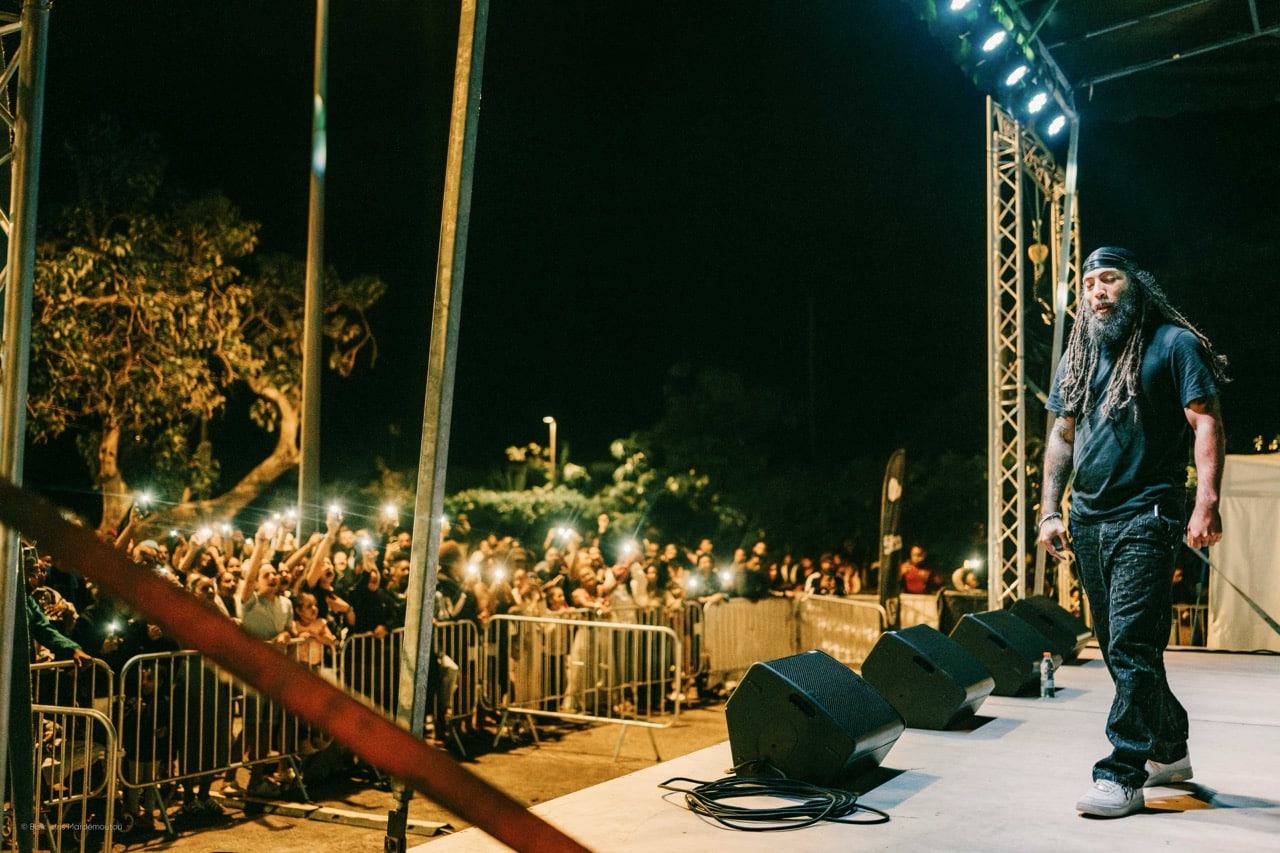 La scène se charge ensuite d’une autre intensité. Jaliloff entre en scène après une introduction par DJ Alkatraz avec une rage maîtrisée. Son rap est brut, il capte l’attention, la retient, la bouscule, avec Djvmil en backing vocal. Chaque mot est un coup de poing poétique. La jeunesse de Saint-Benoît l’acclame. Il ne triche pas, il partage. On est dans l’authentique !