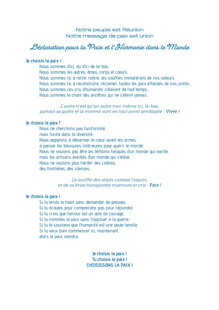Le CRI, Conseil Réunionnais de l’Interculturalité, est à l’origine de l’écriture d’une “Déclaration pour la Paix et l’Harmonie dans le Monde”. Dévoilé le 16 mai dernier, dans le cadre de la célébration de la Journée Internationale du Vivre-Ensemble en Paix, ce texte a été imaginé par un collectif d’auteurs, poètes, journalistes, philosophes de La Réunion (1). Il porte les valeurs de notre plateforme interculturelle, qui fédère les composantes culturelles et historiques de la société réunionnaise : kafs, malbars, tamouls, z’arabes, chinois, comoriens, mahorais, malgaches, juifs, gujratis, indo-pakistanais, yabs, vietnamiens, bretons, etc (2). Et dans ses fondamentaux, le CRI a bien affirmé sa mission : “Être des artisans et ambassadeurs de la paix à La Réunion et dans le monde”. Notre “Déclaration pour la Paix et l’Harmonie dans le Monde” a ainsi pour vocation d’être d’abord offerte à La Réunion, terre d’un vivre-ensemble qui mérite d’être consolidé, amplifié et diffusé à l’ensemble des fuseaux horaires, répondant ainsi à l’incantation de notre devise “Florebo quocumque ferar”. Cette Déclaration doit ensuite “sauter la mer” et être portée par les Réunionnais, et notamment les Réunionnais du monde, partout où l’humain est présent.