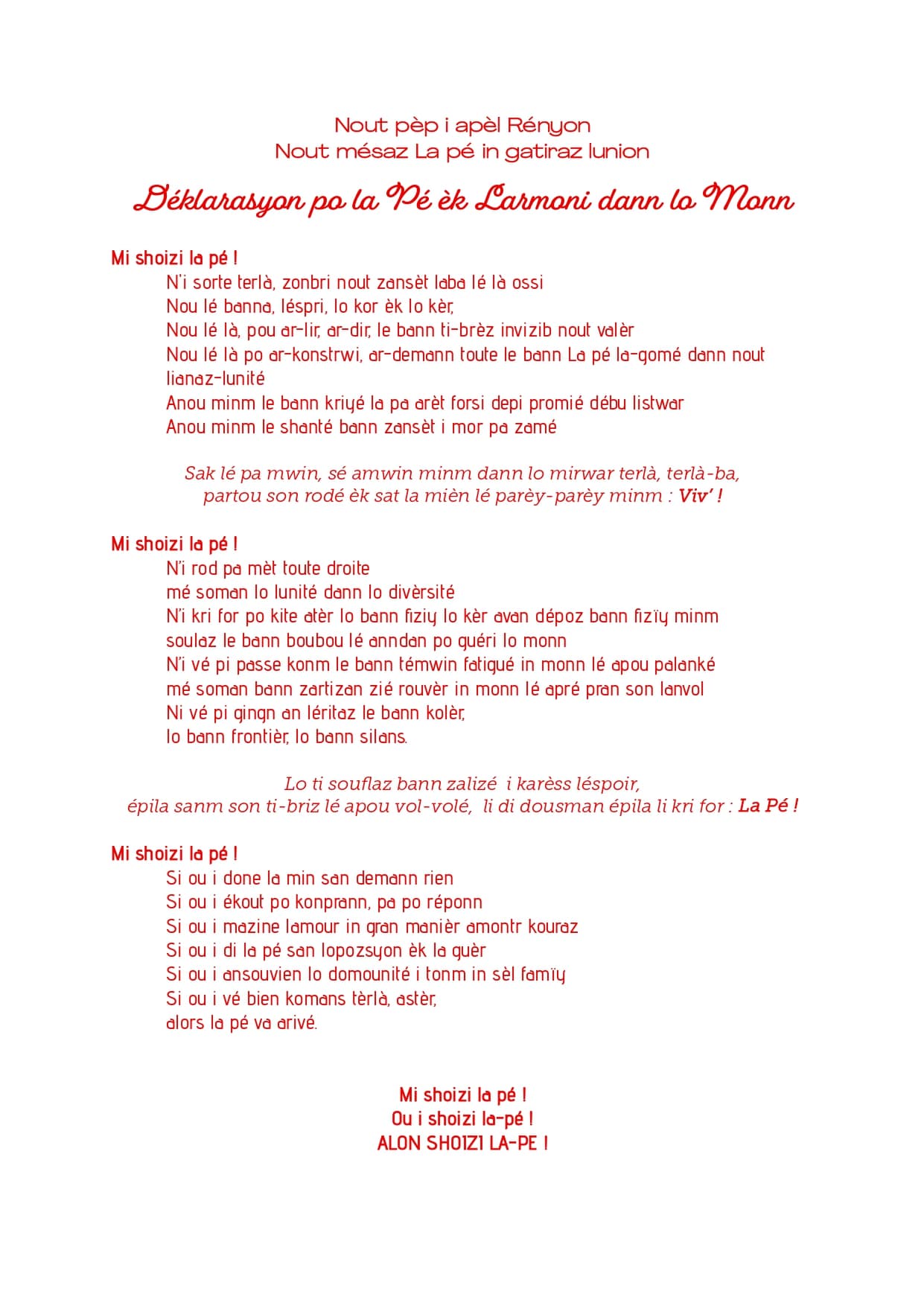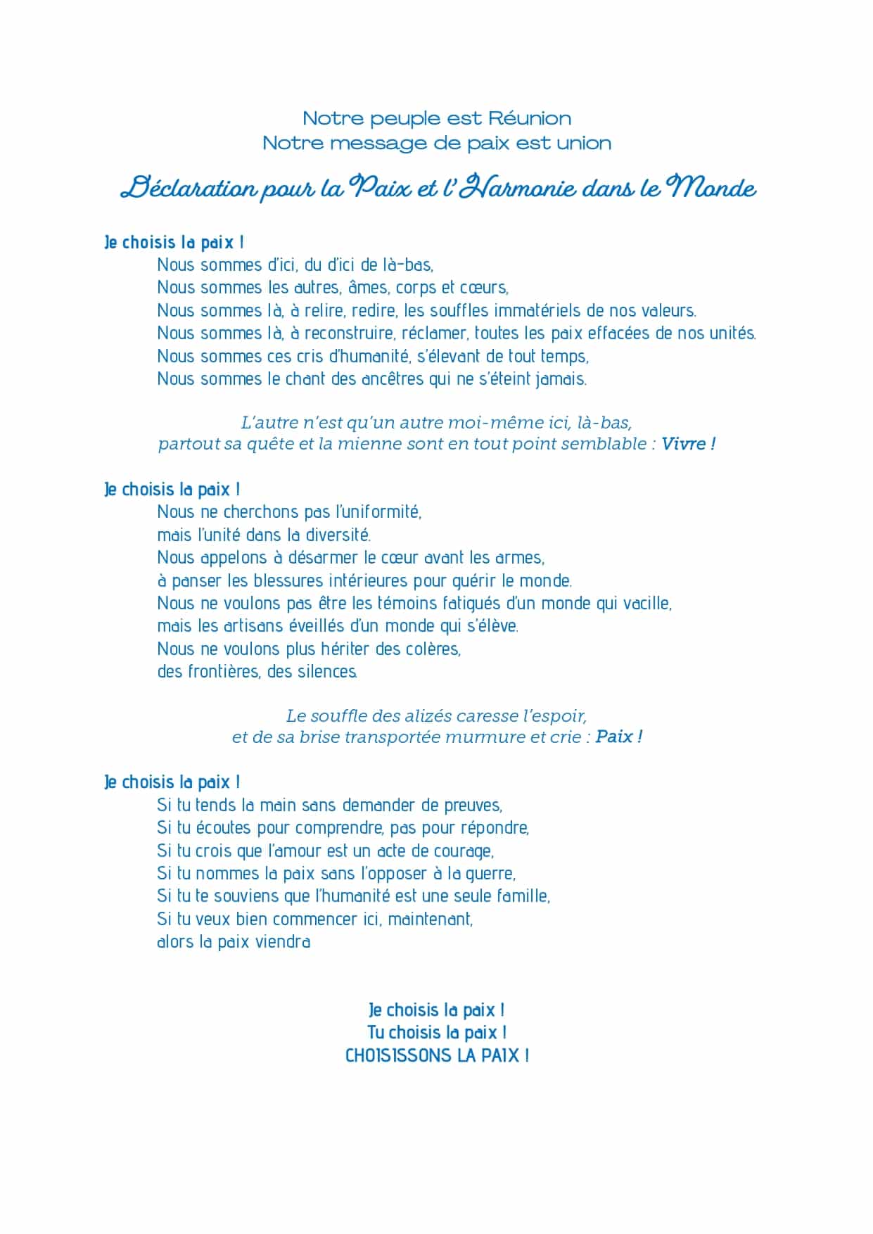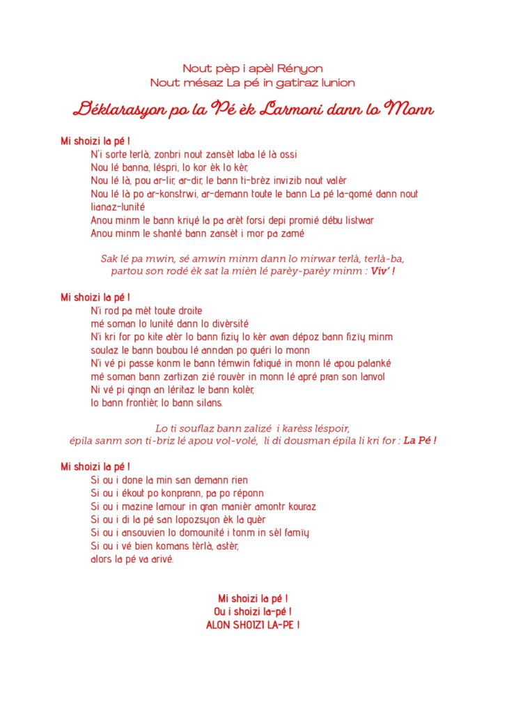 Que notre ambition devienne celle de La Réunion. Elle est de porter cette Déclaration et ses traductions dans les différentes langues et différents dialectes du monde jusqu’à l’UNESCO et l’ONU, dans les prochains mois. Nous mettons en place un processus de diffusion à La Réunion, dans la région india-océanique, dans les pays composant le peuplement de La Réunion, en France hexagonale et sur le continent européen, et à travers le monde. Une grande ambition basée, notamment, sur le réseau des fédérations et associations composant le CRI, et la grande toile des Réunionnais du Monde. Nous sommes heureux de partager avec les Réunionnais cette “Déclaration pour la paix et l’harmonie dans le monde“, dont les versions française et créole réunionnais sont les premiers pas. À nous tous d’en être les ambassadeurs, pour faire “réyoné” La Rényon et apporter cette lumière de paix et de fraternité au-delà de nos rivages. Lisez la Déclaration, faites-la lire, affichez-la, copiez-la, distribuez-la, et que vive La Réunion interculturelle, celle que l’on aime tous.