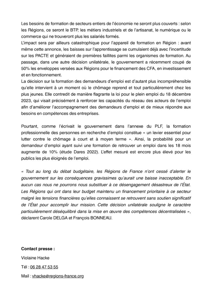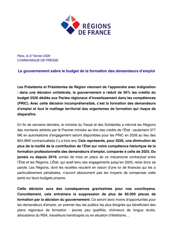 L’ensemble des régions de France a pris connaissance avec consternation des décisions prises par le gouvernement concernant les crédits pour l’emploi et la formation. Globalement, ces crédits accusent une baisse de 56%. L’association Régions de France a fait part de son indignation dans un communiqué que vous trouverez ci-joint.