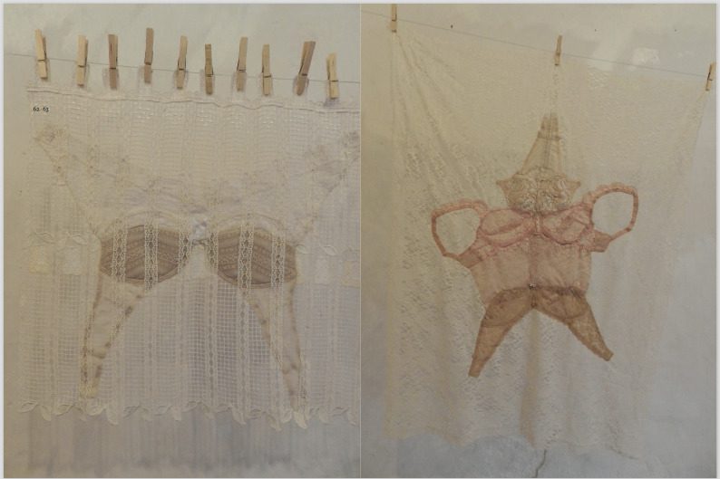 Les vêtements, détournés de leur fonction première et cousus ensemble tels des tapimandian[2], deviennent des ciels de tissus et d’immenses filets suspendus au mur, déroulés au sol, ou tendus sur des façades de bâtiments. Les dessous féminins en dentelle de couleur sont découpés et cousus à plat dans des compositions insolites sur fond d’étoffe ajourée et brodée, aux motifs floraux ou géométriques d’anciens rideaux qui désormais montrent davantage qu’ils ne cachent. Suspendus en toile libre sur des cordes à linge par des pinces en bois, ou simplement cloués au mur tels des trophées, ces hybrides de dessous usagés nous projettent en voyeurs dans un espace domestique, une improbable arrière-cour où sèche le petit linge à l’abri des regards. L’intime exposé dans des jeux de piste texturés et colorés, révélant des sensualités décomposées et autres désirs évanouis, évoquant aussi parfois les draps témoins de la virginité de la mariée et montrés au grand jour…