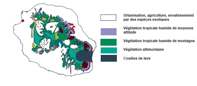 Encore un pan de notre patrimoine qui disparaît. Pourquoi ? Il vivait dans la tamarinaie, forêt d’altitude, au milieu de ses frères, et cette forêt a été partiellement défrichée pour le développement économique des Hauts, et remplacée par des plantations de cryptomérias dès 1966, puis des pâturages à partir de 1978. La carte de la végétation de La Réunion montre ce qu’il reste de la végétation tropicale humide de montagne :