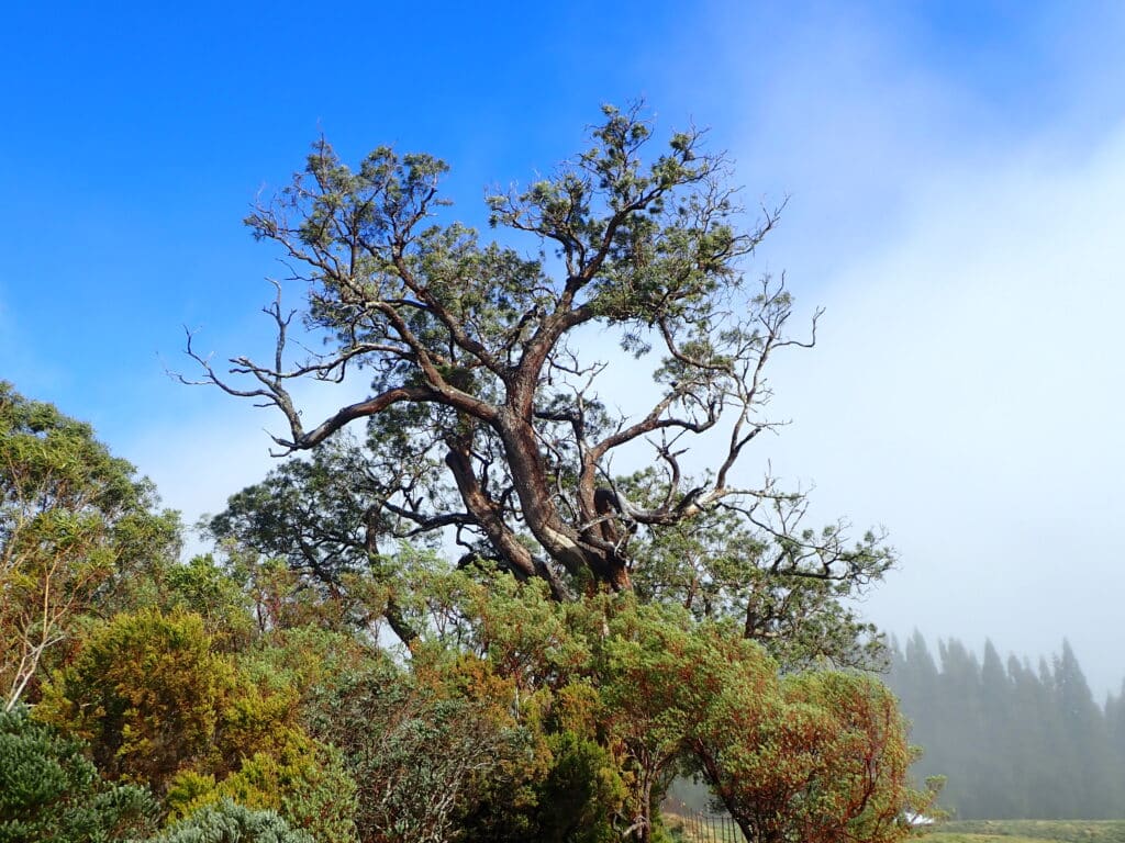 Dans un bosquet, on ne peut pas rater le Tamarin Dodo, avec son tronc imposant et ses branches torturées, à quelques mètres de la clôture. Il est facile de le reconnaître car il est beaucoup plus grand et beaucoup plus large que les arbres qui l’entourent. C’est une curiosité naturelle à ne surtout pas manquer quand on marche dans les environs, et qui ne nécessite qu’un détour de deux minutes. Le Tamarin Dodo est un ancêtre, né certainement avant l’arrivée des hommes sur l’île. Il a sans doute connu les dodos s’ils vivaient là (ce n’est pas l’origine de son nom, qui proviendrait du surnom d’un des propriétaires de l’endroit), ou les tortues, avant qu’elles ne soient décimées. On estime qu’il est âgé de 400 ans ! C’est un superbe tamarin des hauts, Acacia heterophylla, espèce végétale endémique de La Réunion, emblématique, fournissant un excellent bois d’ébénisterie. Celui-ci est particulièrement remarquable par sa hauteur et sa largeur : il mesure 20 mètres de haut, pour un tronc d’environ 2,50 m de diamètre et 7,50 m de circonférence. Cet arbre est à la limite d’altitude tolérée par l’espèce, qui aime pousser entre 1 200 et 1 900 mètres d’altitude. Combien de pique-niques ont eu lieu sous son ombre ? Il a même inspiré un atelier d’écriture. Tout cela fait tristement partie du passé. Le Tamarin Dodo a été complètement déraciné par le cyclone Garance le 28 février 2025.