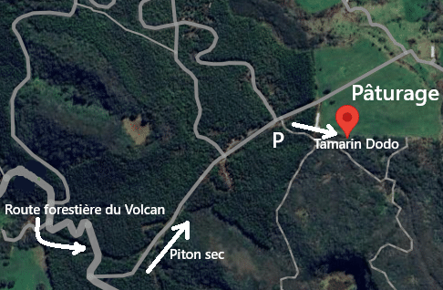 Rando Pitons, Visorando, Randoréunion, Carte de La Réunion, Département de La Réunion… nous incitent toujours, sur internet, à aller rendre visite au fameux Tamarin Dodo. Pour s’y rendre, depuis Bourg-Murat, prendre la route forestière du Volcan en direction du Piton de la Fournaise. Après les fermes et un grand parking à droite, sous les cryptomérias, poursuivre jusqu’au panneau de Piton Sec. Tourner à gauche et rejoindre le Piton Guichard. Se garer, 550 m plus loin, dans un virage à gauche en angle droit. Le sentier débute à droite de ce virage, sous les cryptomérias. En sortant de la forêt, prendre tout de suite à gauche et longer le pâturage jusqu’au bout du chemin.