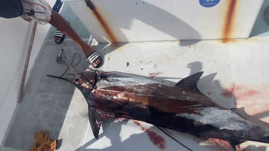 Au cours de la journée , Steven et Benoît ont pêché un marlin de 44 kilos et un thon germon de 24 kilos. Une pêche plutôt bonne pour eux. Une fois revenus à terre, ils vont directement à la poissonnerie. Avec un marlin qui se vend à 6 euros le kilo et le thon à 8 euros le kilo, la recette du jour est de 463 euros.