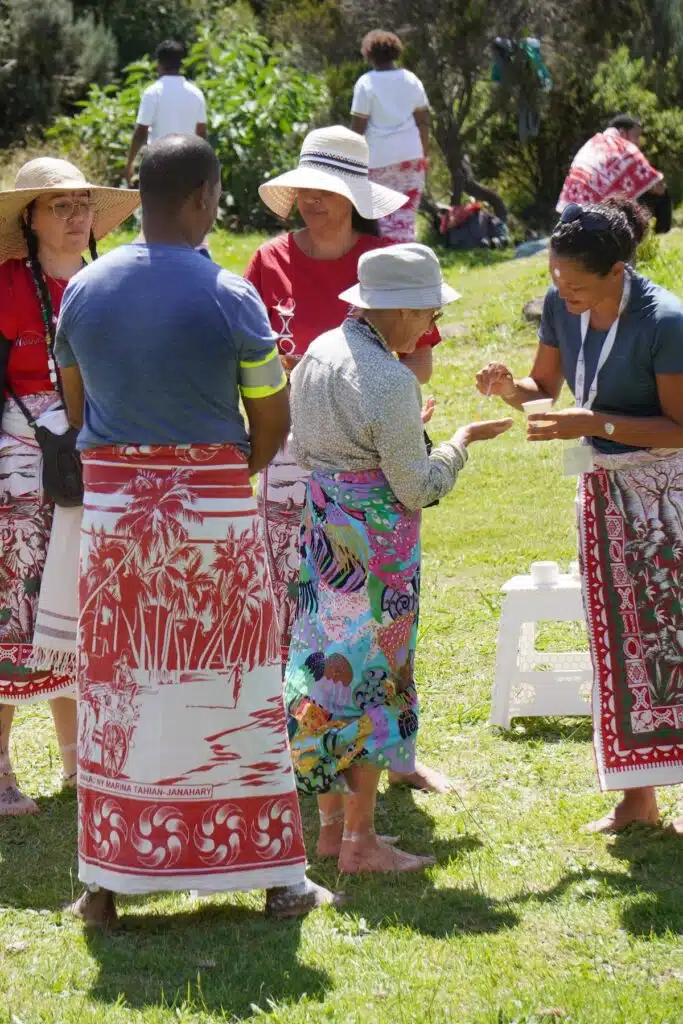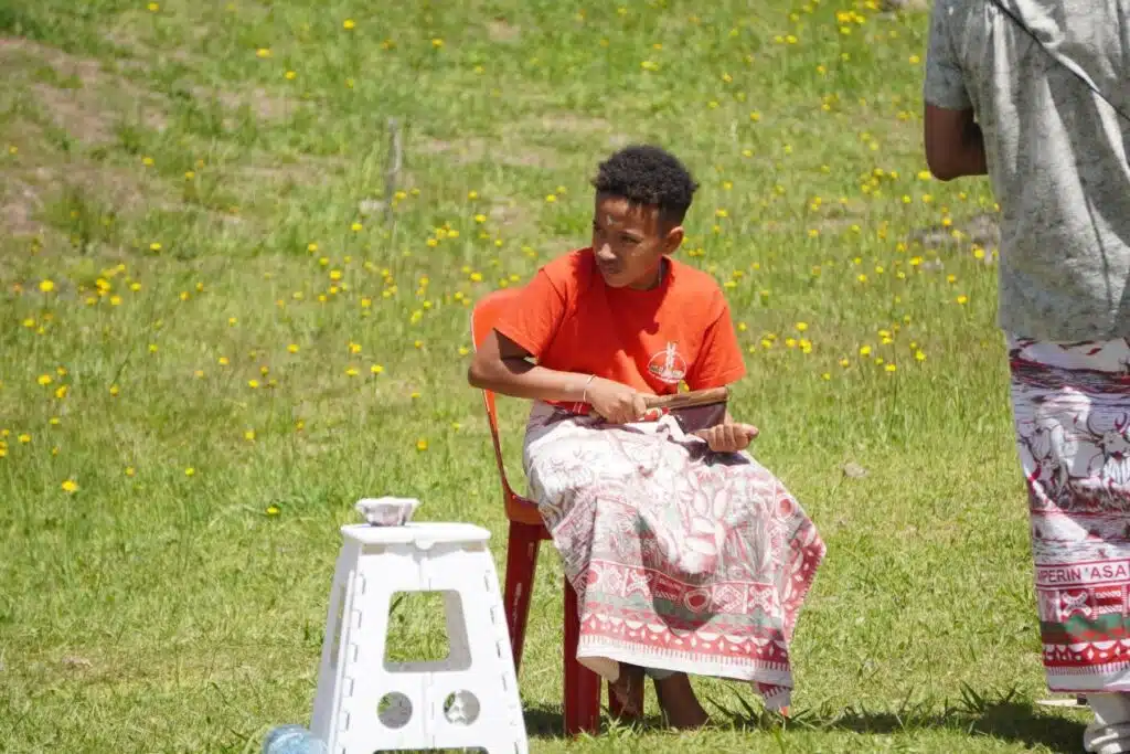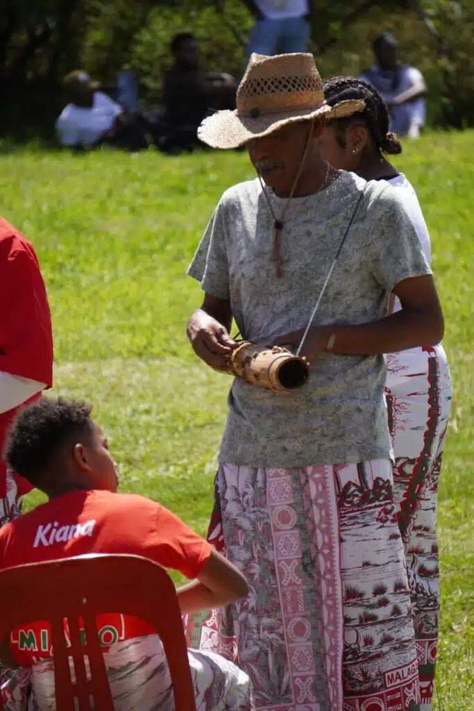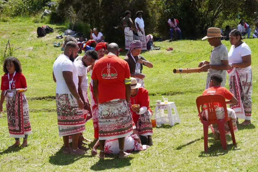 Les grappes d’hommes et de femmes s’installent au gré d’un ombrage, d’une tente plantée la veille ou d’une table de pique-nique. Les notes du Valiha se perdent dans la brise légère alors que deux files se sont formées pour guider les arrivants vers un.e officiant.e chargé.e de les purifier en quelques mots et quelques gestes. Paix, santé et prospérité. Un point de terre blanche et sacrée sur le front, deux traits sur les chevilles. Un peu de miel au creux de la paume.