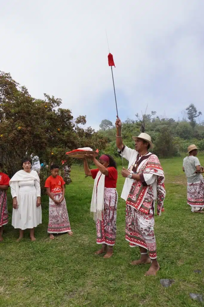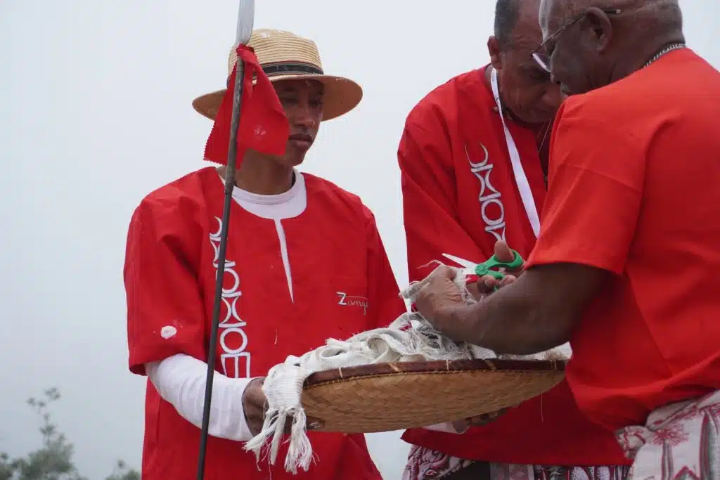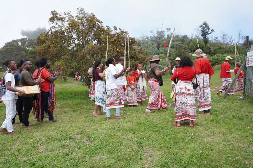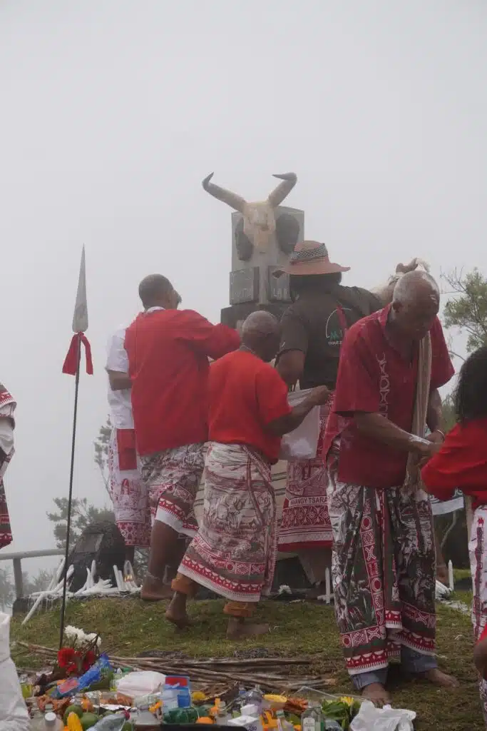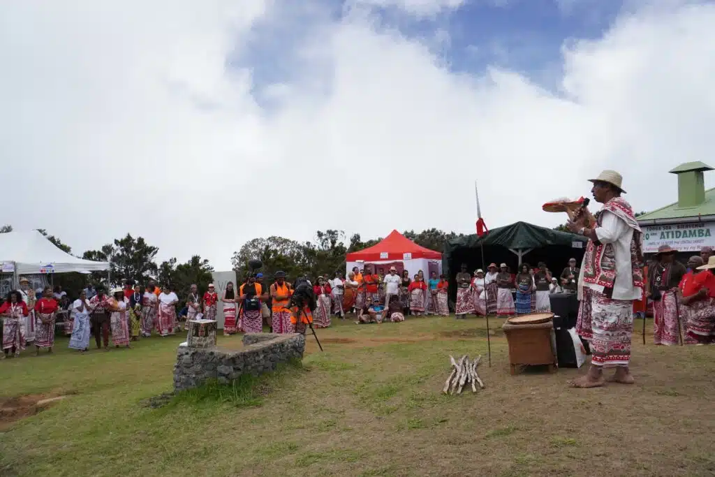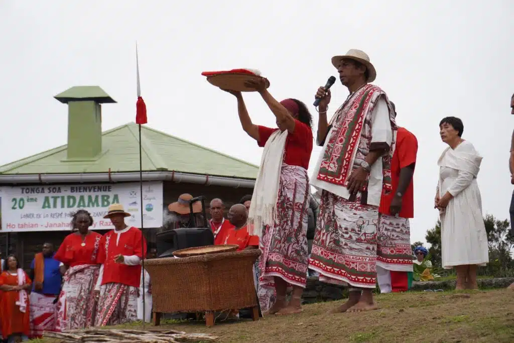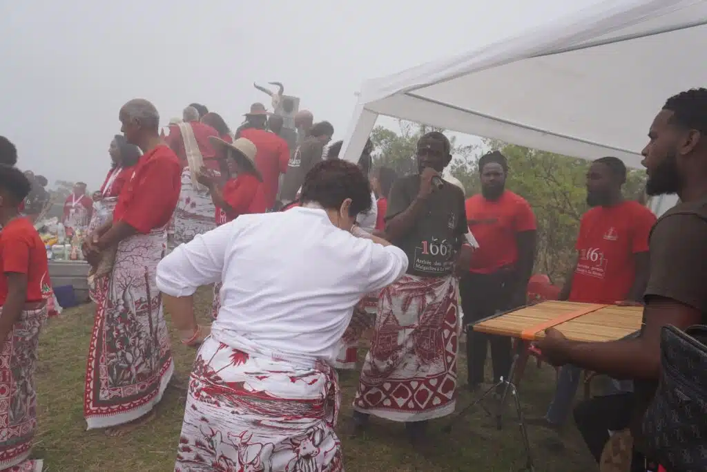 Au détour du sentier quelques fanions vert-blanc-rouge et un collier de perles apparaissent comme le deuxième indice des origines malgaches du rassemblement. Là-haut, après une heure et demie d’ascension, il est temps de revêtir le lambahoany et de remiser ces chaussures dans un coin.