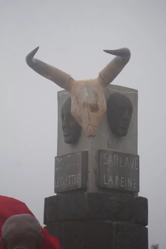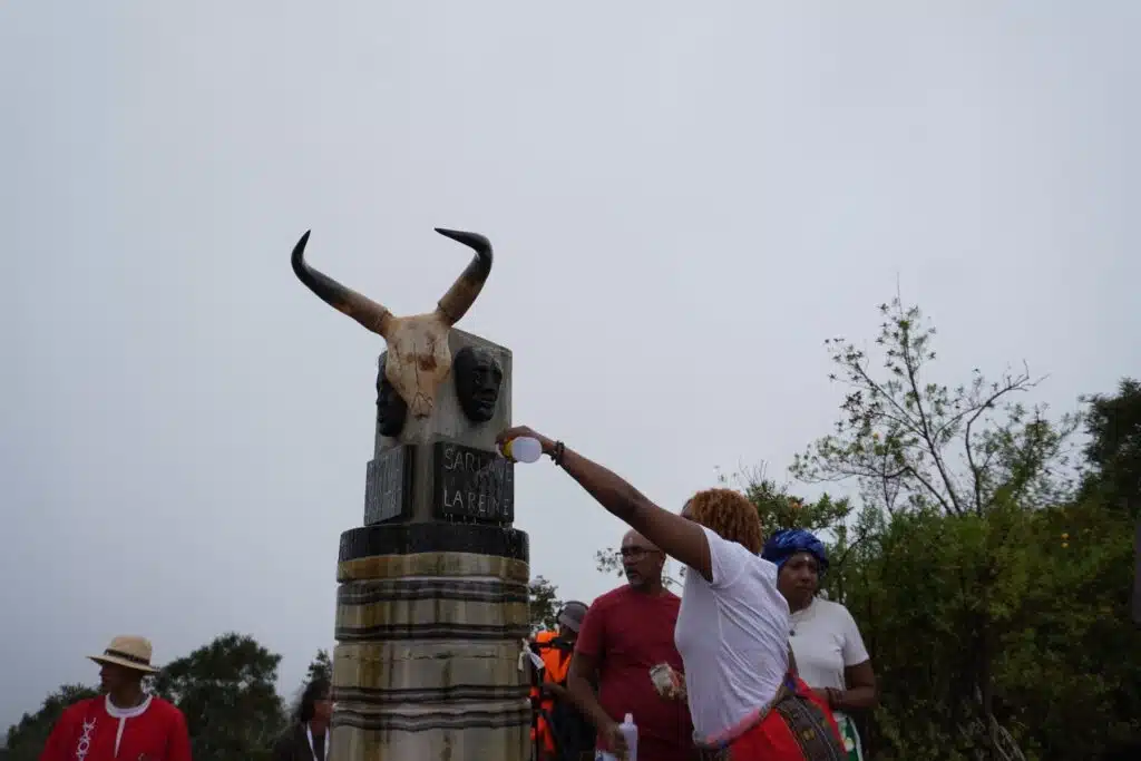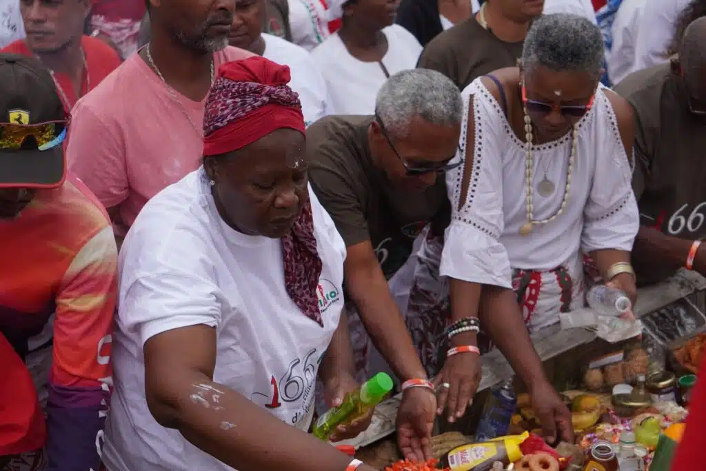 Les centaines de participants processionnent, derrière les officiants guerriers, jusqu’à l’enclos sacré des ancêtres. « Nout zansèt, Nout fors », clament-ils. Ils y entrent en quatre temps représentant les points cardinaux : les gens du Nord, ceux du Sud, de l’Est et de l’Ouest.