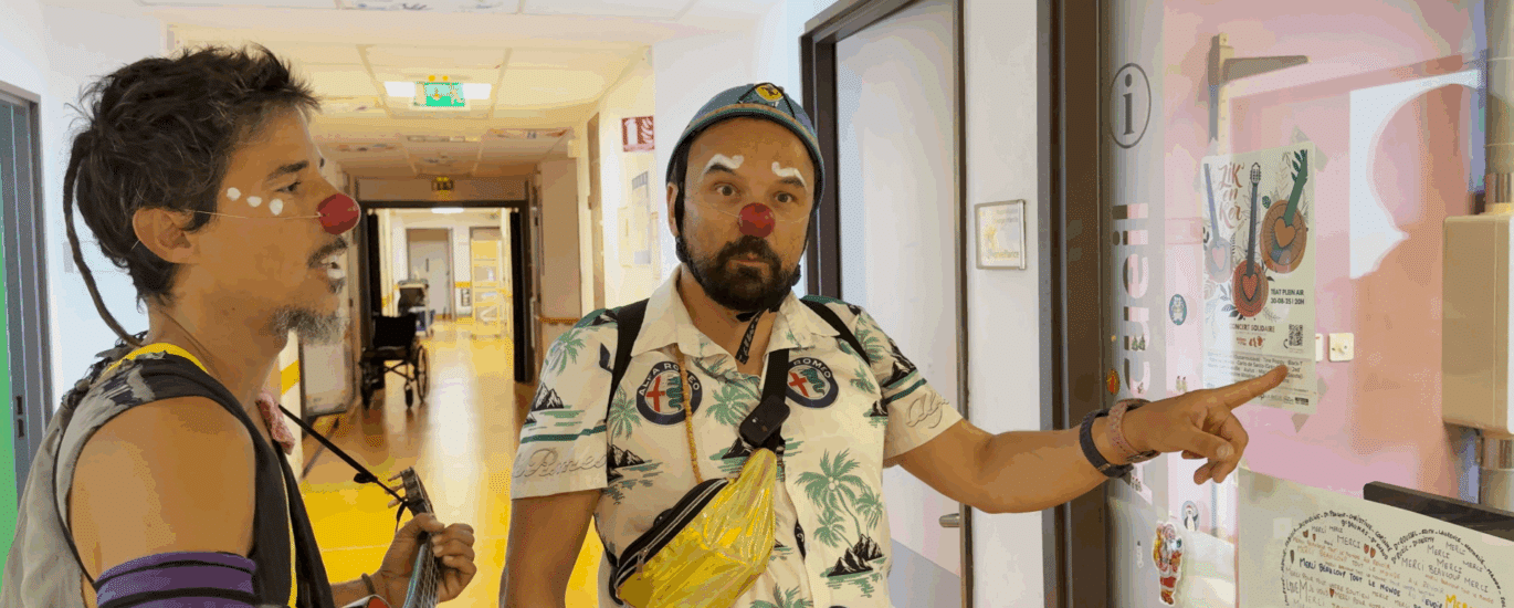 Avant de passer dans les chambres, les deux collègues font une parade dans les couloirs, comme pour annoncer aux enfants qu’ils arrivent. Chanson, guitare, interaction avec les passants ou les patients dans les couloirs : leur bonne humeur contamine généralement ceux qui croisent leur chemin.