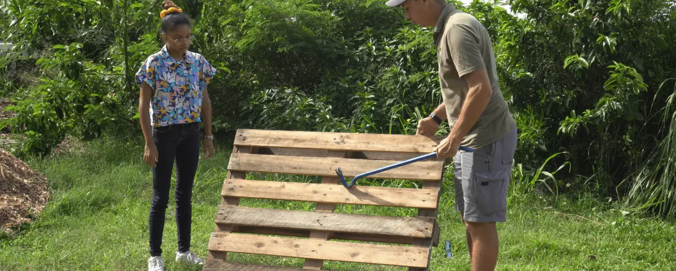 Bruno et l’association Ti Planteur nous reçoivent à Saint-Louis pour nous montrer leurs techniques de démontage de palette. Pour ne pas abimer vos planches, il est important de suivre toutes les étapes dans le bon ordre. Un pied de biche, un marteau et c’est parti !