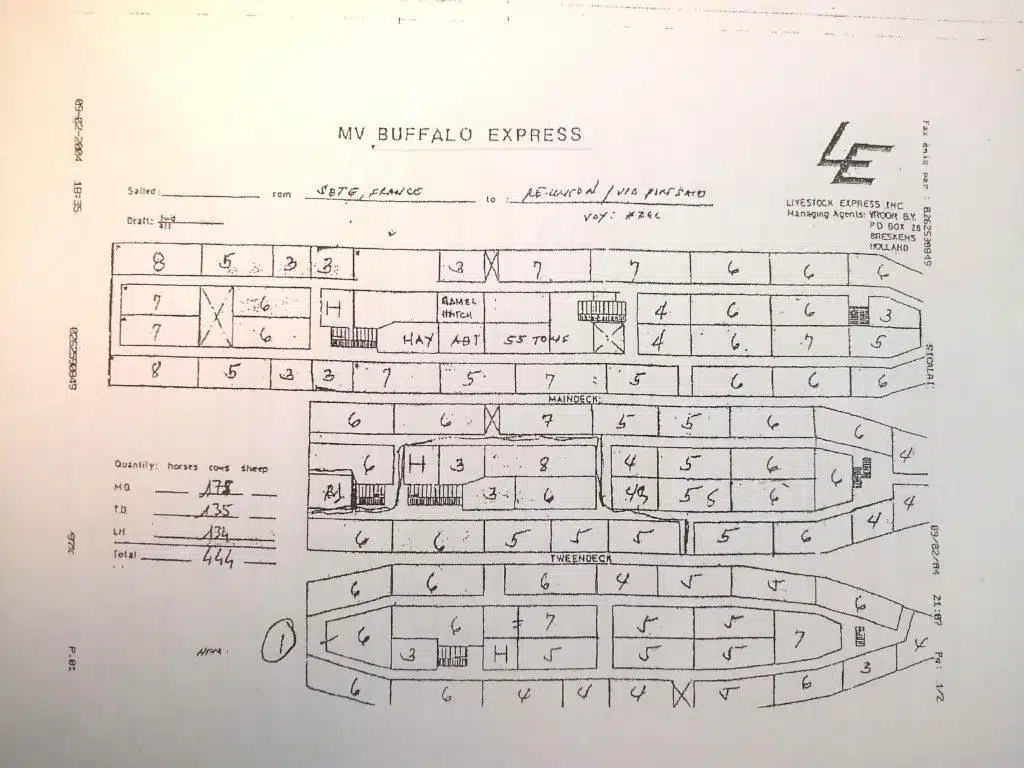 Ils sont 444 animaux à avoir embarqué sur le Buffalo express au port de Sète, ce 30 août 2003. La plupart sont arrivés la veille, sauf les 125 taurillons Sofrana. Contrairement à aujourd’hui, où seule la Sica Lait était favorable à l’importation de nouvelles vaches, à l’époque, 178 animaux sont destinés à la coopérative laitière quand 266 sont embarqués pour les besoins de la coopérative d’élevages à viande, la Sica Revia. Les importateurs ont choisi de voyager par bateau notamment car cela coûte moins cher.