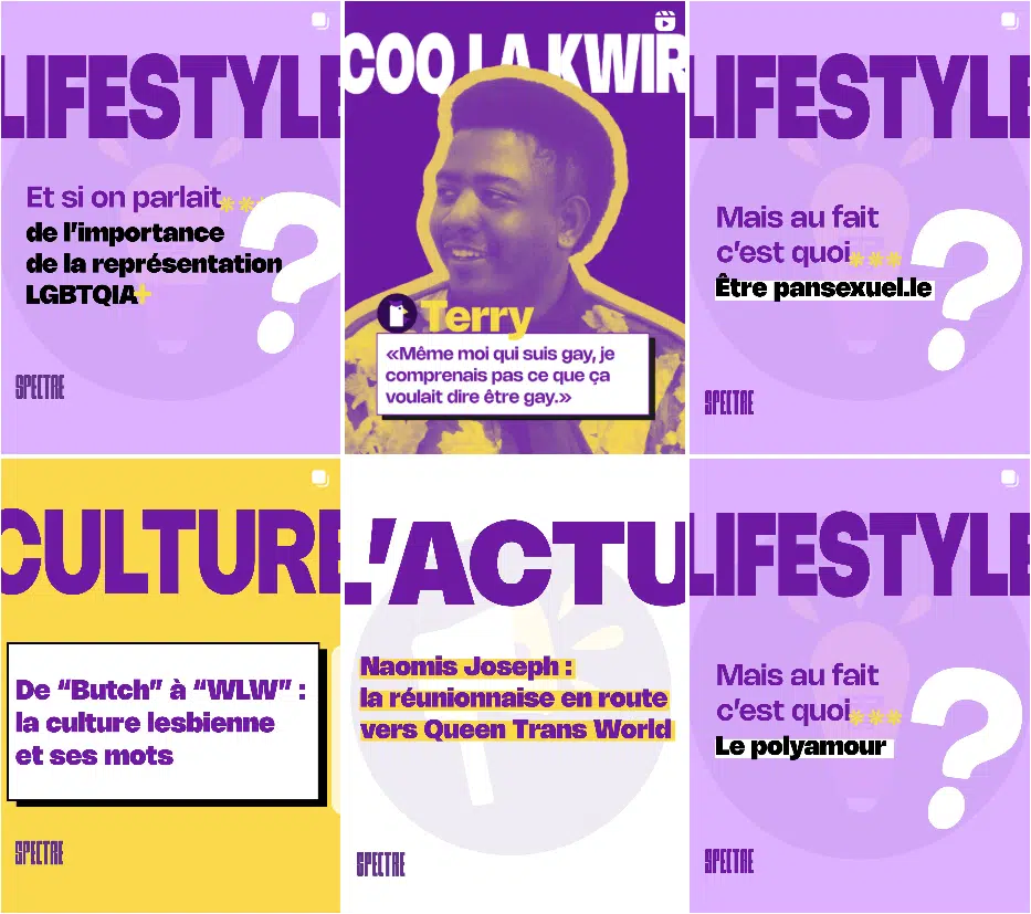 Spectre c’est un média queer en ligne créé en 2023 par des étudiants en communication, d’abord pour un exercice d’école. Et finalement, de cet exercice est né un vrai média, unique à La Réunion pour la communauté queer. Vulgarisation, interviews, décryptage d’actualité, Spectre s’impose pour faire briller ces Réunionnais trop longtemps restés dans l’ombre.