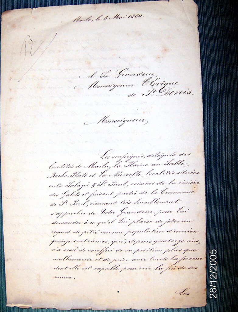 On a retrouvé dans les archives de l’évêché une supplique d’habitants de Marla datée du 6 mai 1880 et adressée à l’évêque de l’époque, Mgr Dominique Clément Soulé. Elle est signée par J.E. RICQUEBOURG, Aimé ELISABETH et Théogène LEBEAUD.