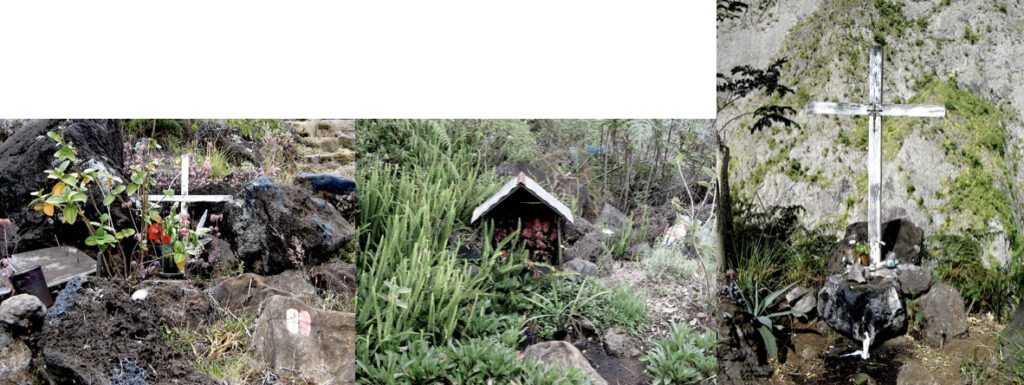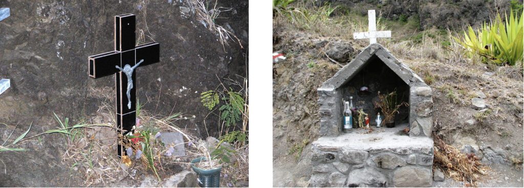 Les sentiers de Mafate sont parsemés de ces vierges et de ces croix dont les habitants des îlets recherchent la protection, tout en les remerciant simultanément de la leur accorder.