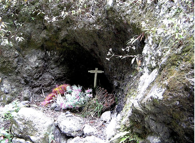 Dans une anfractuosité naturelle aménagée dans la roche, on trouve une chapelle agrémentée d’une croix « très artisanale », entourée de gerbes de fleurs impressionnantes. À ma connaissance c’est un des rares oratoires utilisant simplement une cavité naturelle.