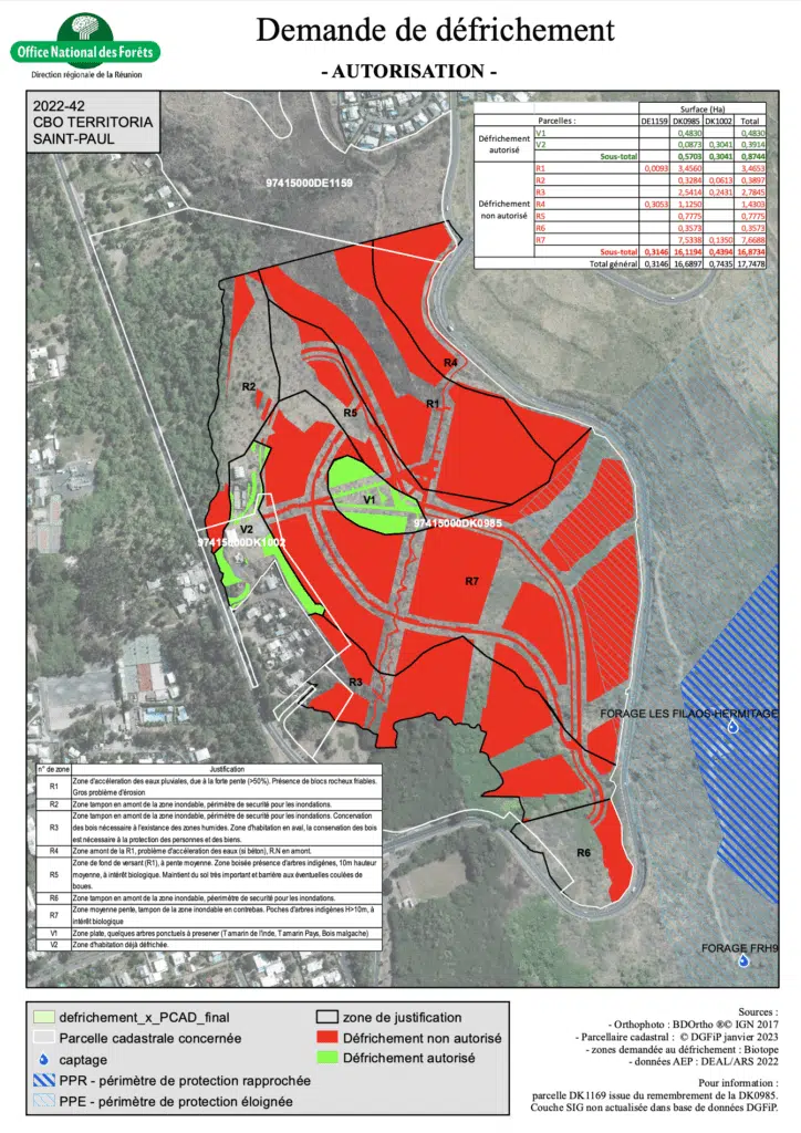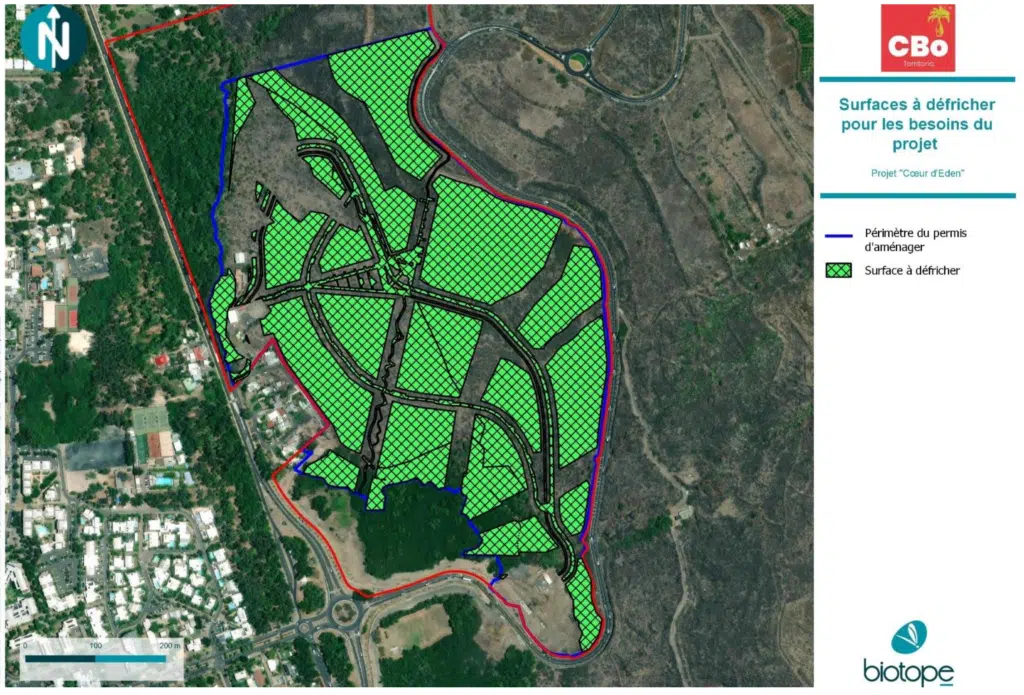 Le 17 octobre 2022, il déposait sa demande de dérogation à l’interdiction générale de défricher qui concerne toute La Réunion. La demande portait sur 17,7 hectares sans compter les zones qui feront l’objet d’aménagements paysagers au prétexte que l’occupation des sols resteraient inchangés. En fait, seuls les talwegs (ravines à sec) et les fortes pentes échapperaient à la tronçonneuse. Bataille de chiffres : Quand la DAAF relève « 95% d’artificialisation du site, CBO assure que l’imperméabilisation n’en représente que 53%.