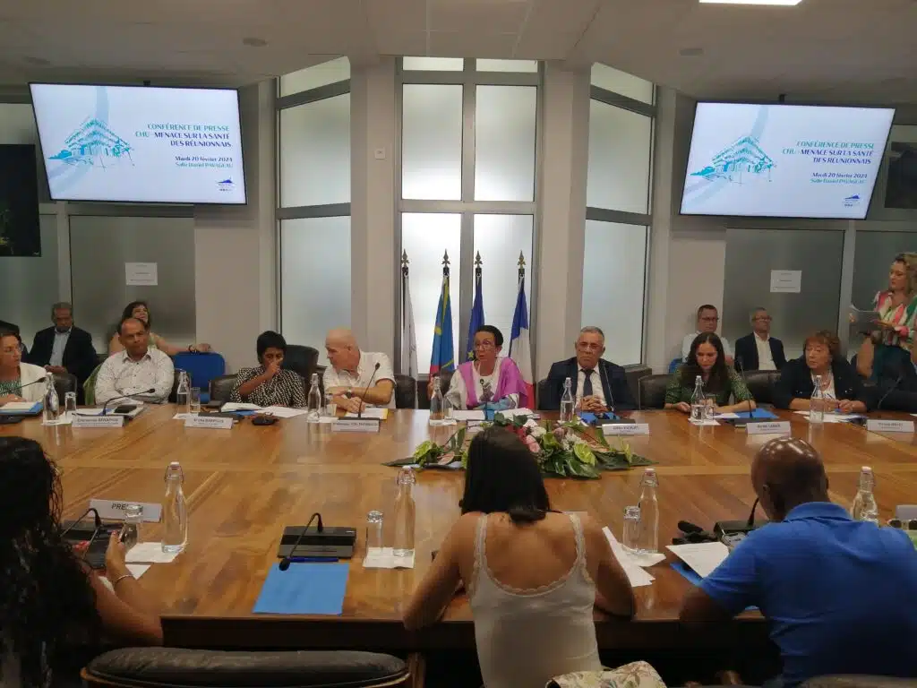 La conférence de presse marque-t-elle un tournant dans la mobilisation syndicale contre la réduction des moyens financiers alloués à l’hôpital public ? Intitulée sobrement « Menace sur la santé des Réunionnais », elle a rassemblé pour la première fois l’ensemble des acteurs de la santé réunionnais et des responsables politiques : élus du conseil de surveillance du CHU, un représentant des médecins, une représentante des usagers, l’ensemble des syndicats, plusieurs députés et sénateurs. Parmi les absents : l’Agence régionale de Santé (ARS) qui applique localement les décisions de l’Etat en matière de santé, mais aussi le syndicat FAFPHR.