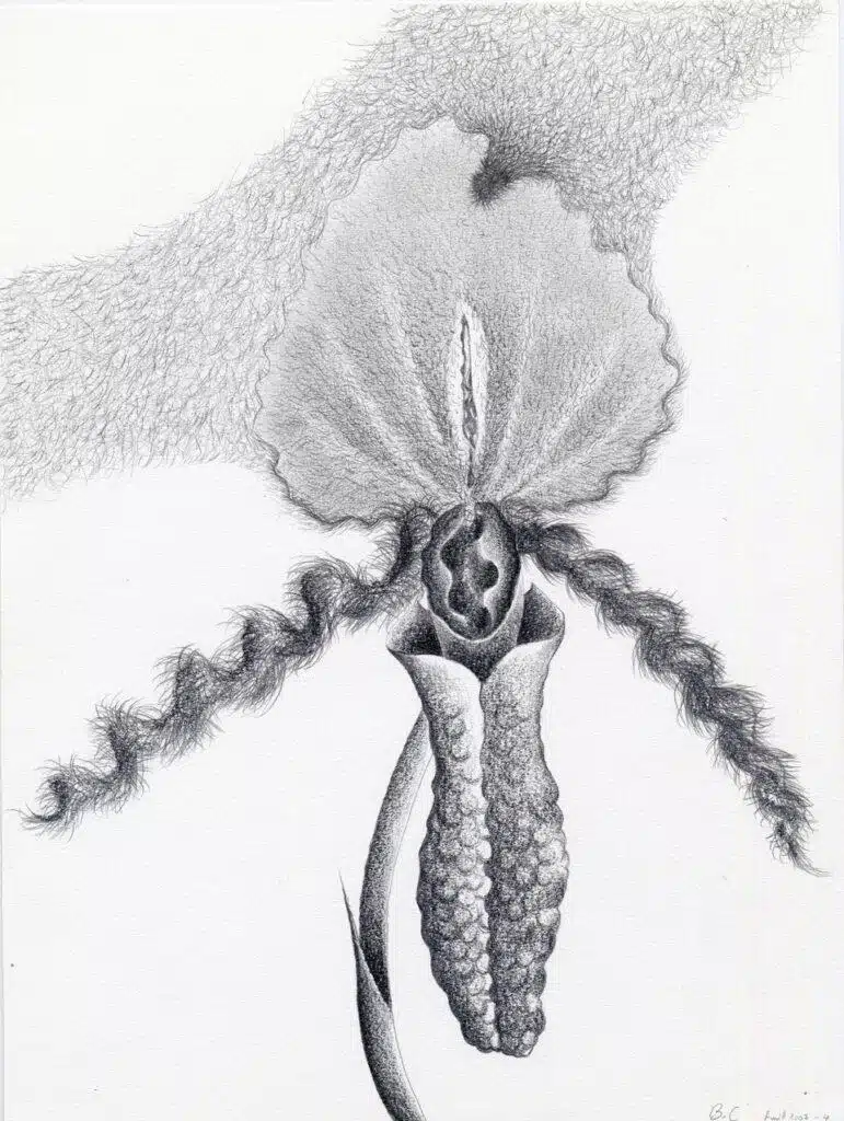 Orchidées de 2003, Papillons de 2004 à partir de chenilles, Luminescences en 2009-2010 à partir de coquillages et de méduses, ou de formes hybrides animales et florales, puis à partir de 2013 bijoux et tresses sur des formats de plus en plus grands… Les séries de dessins s’enchainent selon un mode opératoire chaque fois identique : à partir d’une forme observée ou mémorisée, elle déplie un univers de possibles variations organiques, le plus souvent érotiques et toujours d’un très grand raffinement formel. Le trait de Catherine Boyer emprunte la précision et la rigueur du dessin naturaliste. Très impressionnée par la symétrie, les débordements et la puissance créatrice présentes dans la nature, elle y voit ce qu’elle appelle « une géométrie sacrée » originelle, qui structure le vivant de l’infiniment petit à l’infiniment grand. Et c’est ainsi qu’elle conçoit ses compositions : une structure de base, où son dessin reproduit les formes qu’elle perçoit, puis le stylo ou le crayon l’emportent dans un imaginaire nourri de sensations tactiles très riches et très diverses. Ses Orchidées sont hypersexualisées. La ligne devient surface texturée, muqueuses, viscosités, poils, peaux, lèvres, bourgeons et organes turgescents. « L’orchidée est hermaphrodite, mâle et femelle, elle se féconde elle-même. Je mets en valeur cette fusion entre le masculin et le féminin, je la sublime »[8] . Avec Les Papillons, elle laisse de côté pour un temps l’érotisation de ses motifs —« Je travaille à fond, puis ça s’arrête. Le flux se tarit et je passe à autre chose ». Les compositions très dynamiques, travaillées à l’encre de chine, offrent des noirs profonds, rythmés par des répétitions, consonances de points et de taches, enchevêtrement de lignes et de mouvements.