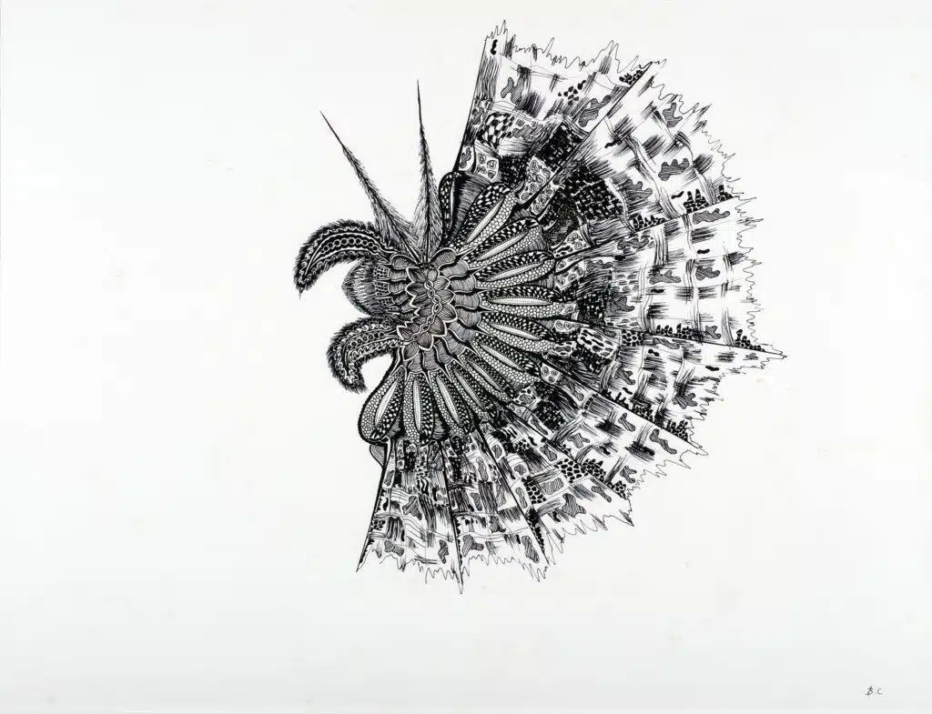 Au cours des longues heures de travail, Catherine Boyer opère une plongée méditative à travers son histoire, sa culture, ses propres couches derrière le vernis social, à l’intérieur de la coquille. Elle s’efface derrière la puissance qui passe à travers sa main, et se laisse surprendre par son travail. « Les dessins me révèlent. Je me découvre dans les deux sens du terme, celui d’une mise à nu, et celui d’une plus grande connaissance de qui je suis » explique l’artiste. C’est un retour à soi perpétuel, où rien n’est laissé au hasard. « Je ne divague pas, dit-elle. Ce n’est pas un vagabondage. Quelque chose est là et je me concentre pour le saisir. Ce n’est pas une rêverie, ni une dérive… C’est un parcours de recherche, une quête de ce que ce qui est caché, et que j’entends dévoiler ».