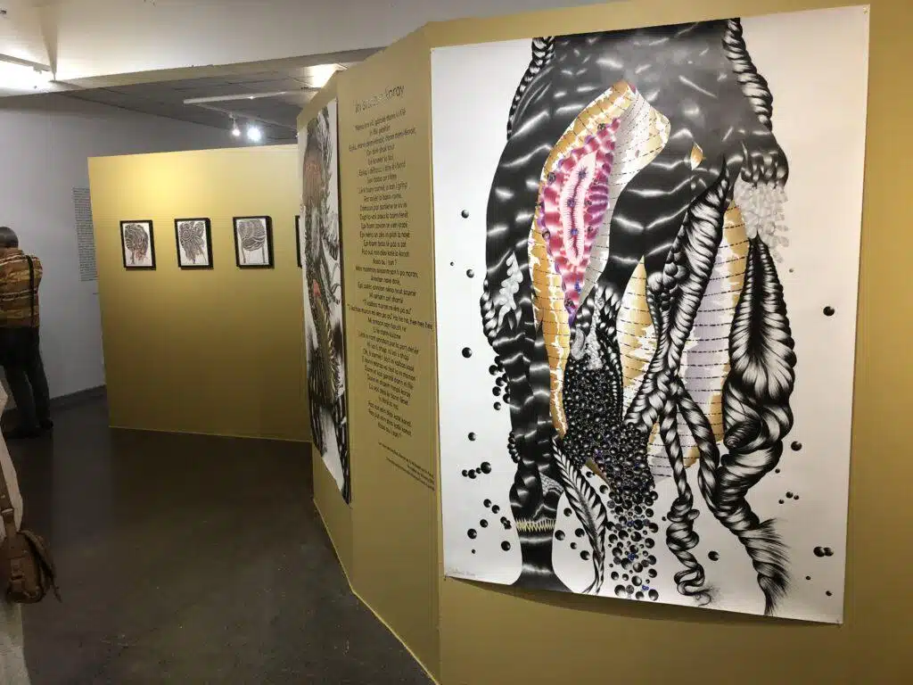 « Jouissances océaniques » est l’intitulé de l’exposition des œuvres de Catherine Boyer qui se tient actuellement à la galerie Hang’art à Saint-Pierre. Cette proposition rétrospective, dont le commissariat est assuré par l’artiste Alain Noël, réunit des pièces importantes du parcours de l’artiste, issues de collections privées et publiques (Artothèque, FRAC et ville de Saint-Pierre) dans une scénographie aux couleurs vibrantes et lumineuses qui réserve quelques belles surprises, avec notamment des œuvres très récentes ! Au cœur de l’exposition : le désir et ses corollaires… depuis les premières pièces de l’artiste, métaphores d’organes sexuels tour à tour féminins et masculins, parfois hermaphrodites, marqués d’empreintes et scarifications par un geste méticuleux et répétitif, jusqu’aux dernières compositions de cheveux et bijoux d’une magnifique complexité, en passant par les séries de dessins déployant un monde graphique très élaboré, dans un foisonnement tenant à la fois du végétal et de l’animal, partageant la légèreté de réminiscences sous-marines et l’inquiétante étrangeté de papillons aux épines acérées et d’orchidées poilues, aux replis de nymphe et autres turgescences dévoilées…