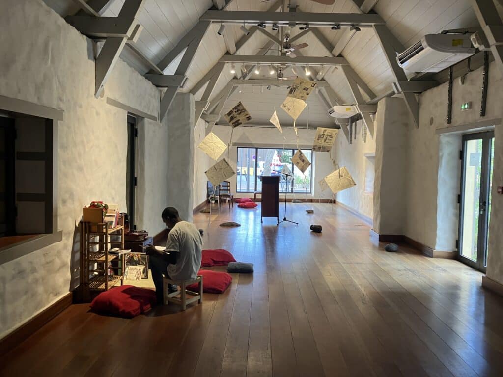 En s’appuyant sur le travail de Magalie Grondin et Goddy Leye, cette exposition, en ce lieu de mémoire, la Longère Sudel Fuma, ouvre un dialogue spatio-temporel (Afrique et l’Océan Indien) où passé et présent se nourrissent des récits partagés dans une esthétique de déconstruction/ reconstruction. «La Kaz Papa» nous invite à nous souvenir ensemble, à être présent à notre histoire postcoloniale, et de repenser notre histoire collective à travers des prismes multiples.