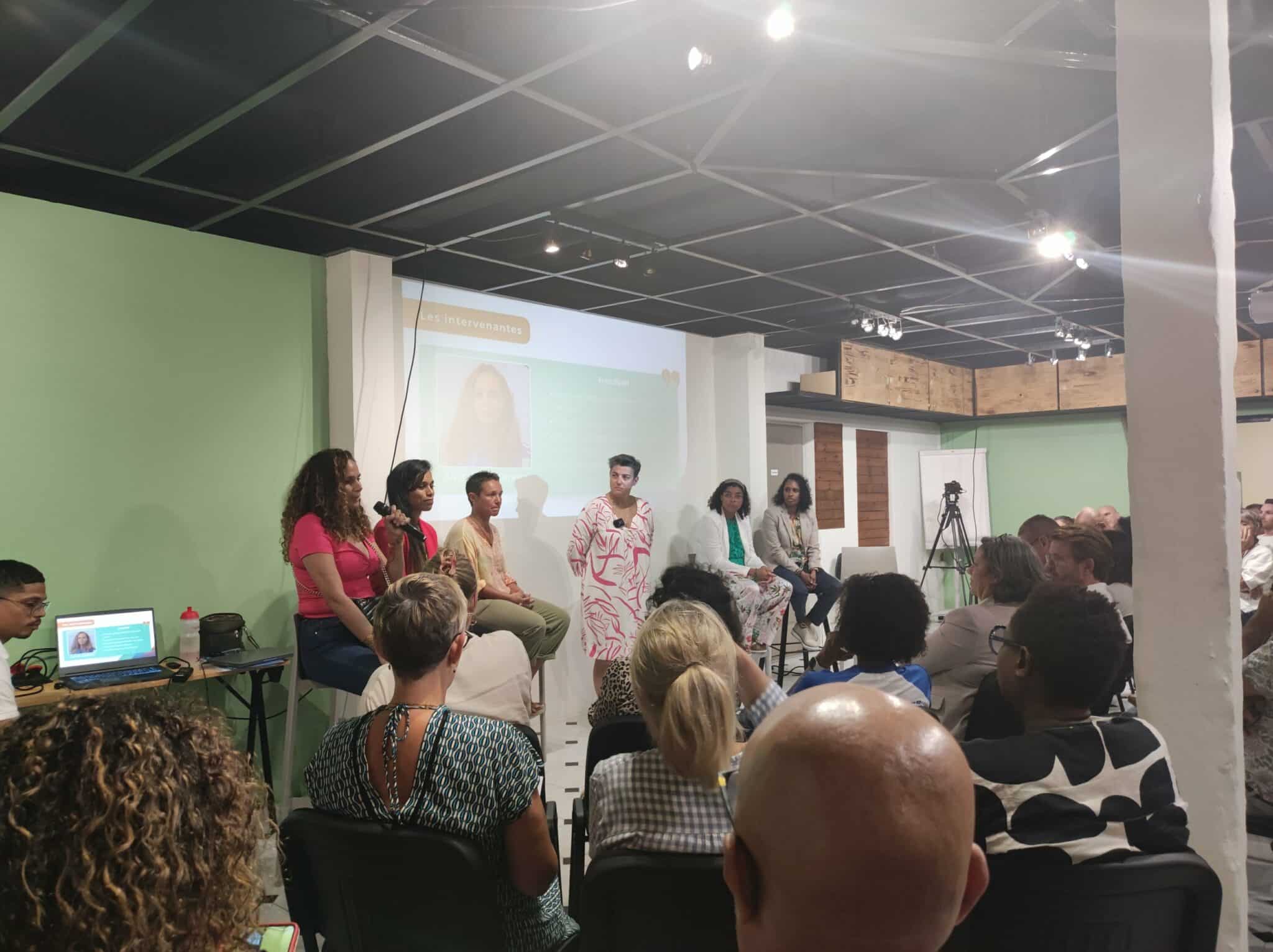 Les intervenantes, figures de la réussite dans le sport à La Réunion, sont Margareth Gustave, Delphine Imoberdorf, Aurélie Rajaonarison, Anitha Grapinet et Gaëlle Mouniama.