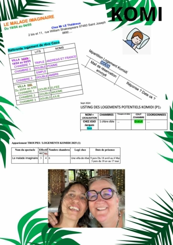 Elles ont commencé à travailler sur le dossier hébergements dès Septembre (contact avec les gîtes et devis notamment). Les blocages des logements sont en principe effectifs début février. Elles termineront fin mai avec les dernières factures. Depuis janvier, elles se revoient chaque mercredi après-midi pour faire le point, compléter des dossiers, faire des devis, procéder à des ajustements …). Elles travaillent en permanence avec Vincent Roca qui assure l’interface entre les troupes et elles, et travaillent également étroitement avec le groupe chargé de la préparation des fiches « Komidi pratique ». Chaque troupe a son référent et sa fiche technique pour tout le festival avec un emploi du temps très détaillé !