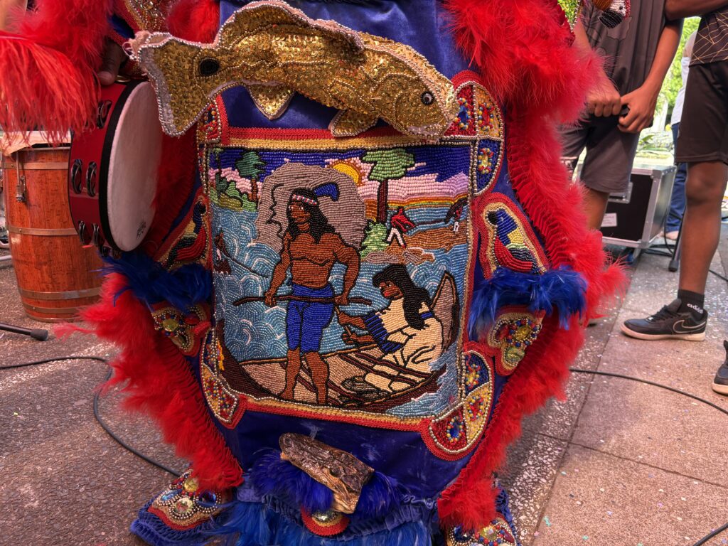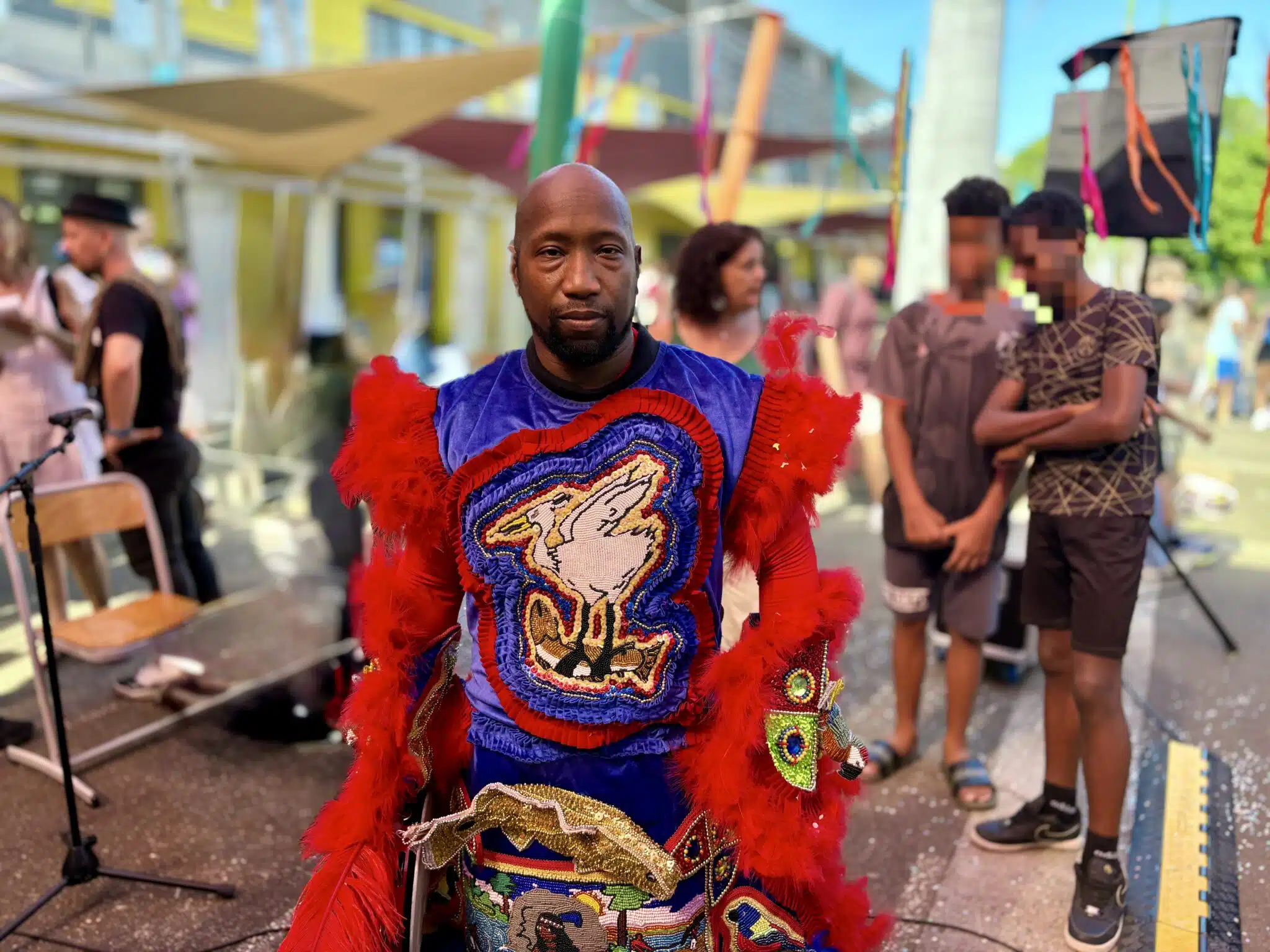 Les costumes participent aussi à cette narration, notamment à travers les perles, qui font écho à l’une de leurs chansons chantée pendant la récréation : « i enfil perle, i enfil plim ». On y retrouve également des animaux totems, ainsi que des influences afro-caribéennes. Parmi les références marquantes, il y a aussi la chanson « Indian Red », chantée par les Mardi Gras Indians lors de l’ouverture de leurs cérémonies à la Nouvelle-Orléans. Elle renvoie à des figures spirituelles comme Shango, un Orisha, une divinité du tonnerre présente dans plusieurs cultures afro-caribéennes.