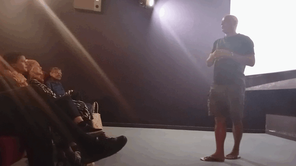 Devant le public, Laurent Pantaléon largue son fonnker : « … le film i apèl Garanti 100 % Kréol … mi kit sur un zile où na poin personne na jamais vu la mer, … mi pik un tête dans l’océan … mi voit ensemb mon band frères … pour regard un film Garanti 100 % Kréol, contentement dans le cœur, l’amour dans le cœur, la joie dans le cœur … »