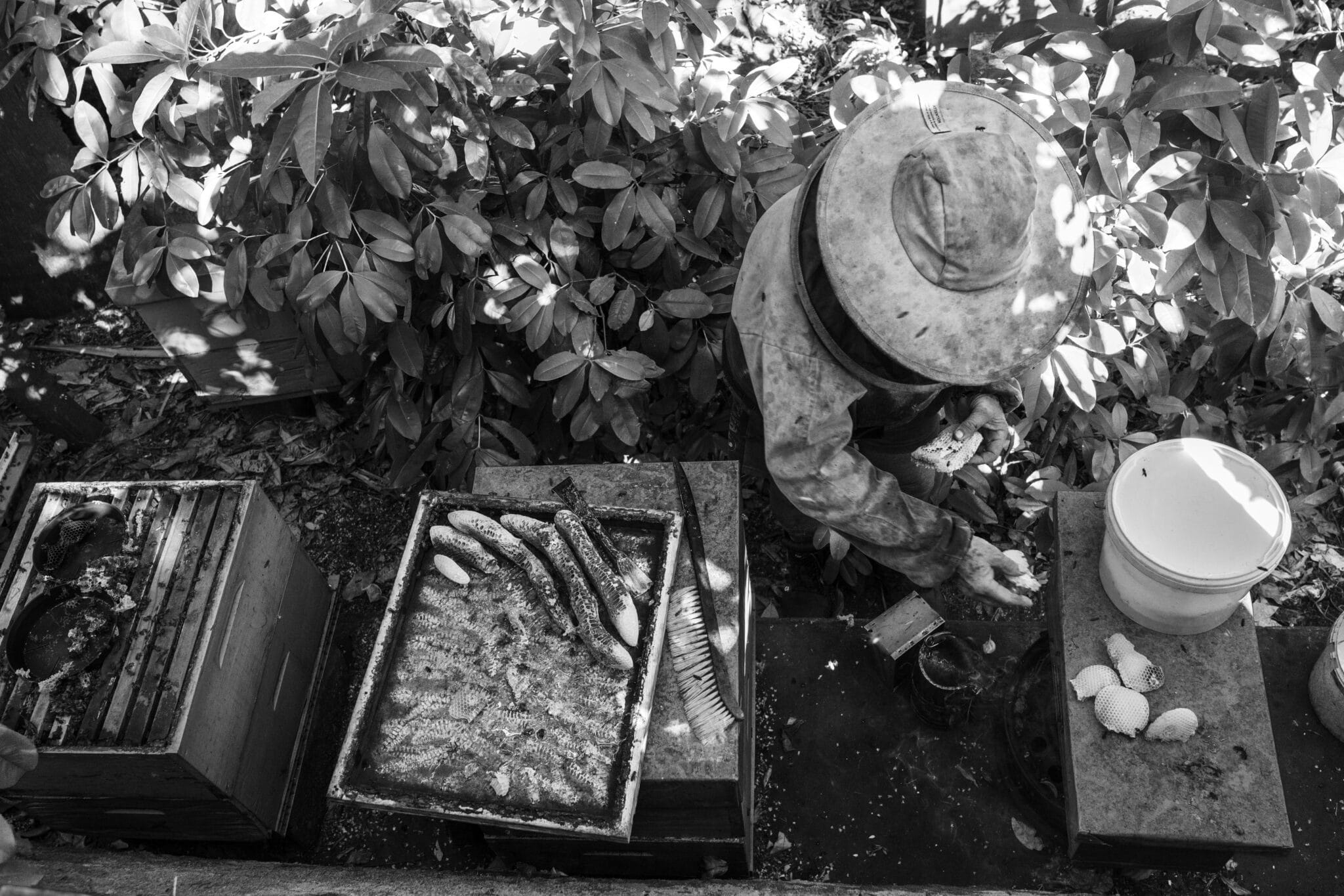 Montvert les Hauts, 14/01/2025. Georget Ognard, apiculteur, debute sa journee dans son jardin ou se trouve ses ruches. Il recolte les alveoles de cette ruche qui est pleine. Photographie par Olivier Ceccaldi/ Agence 43mm.Montvert les Hauts, 14/01/2025. Georget Ognard, apiculteur, debute sa journee dans son jardin ou se trouve ses ruches. Photographie par Olivier Ceccaldi/ Agence 43mm.Montvert les Hauts, 14/01/2025. Georget Ognard, apiculteur, vit dans la meme maison dans laquelle il a grandi a Montvert les Hauts. Son pere l’a construite en 1963. Photographie par Olivier Ceccaldi/ Agence 43mm.Montvert les Hauts, 14/01/2025. Georget Ognard, apiculteur, a toujours ete proche de ses abeilles. Il affirme qu’il a ete pique tellement de fois, qu’il est maintenant immunise contre n’importe quel virus. Photographie par Olivier Ceccaldi/ Agence 43mm.