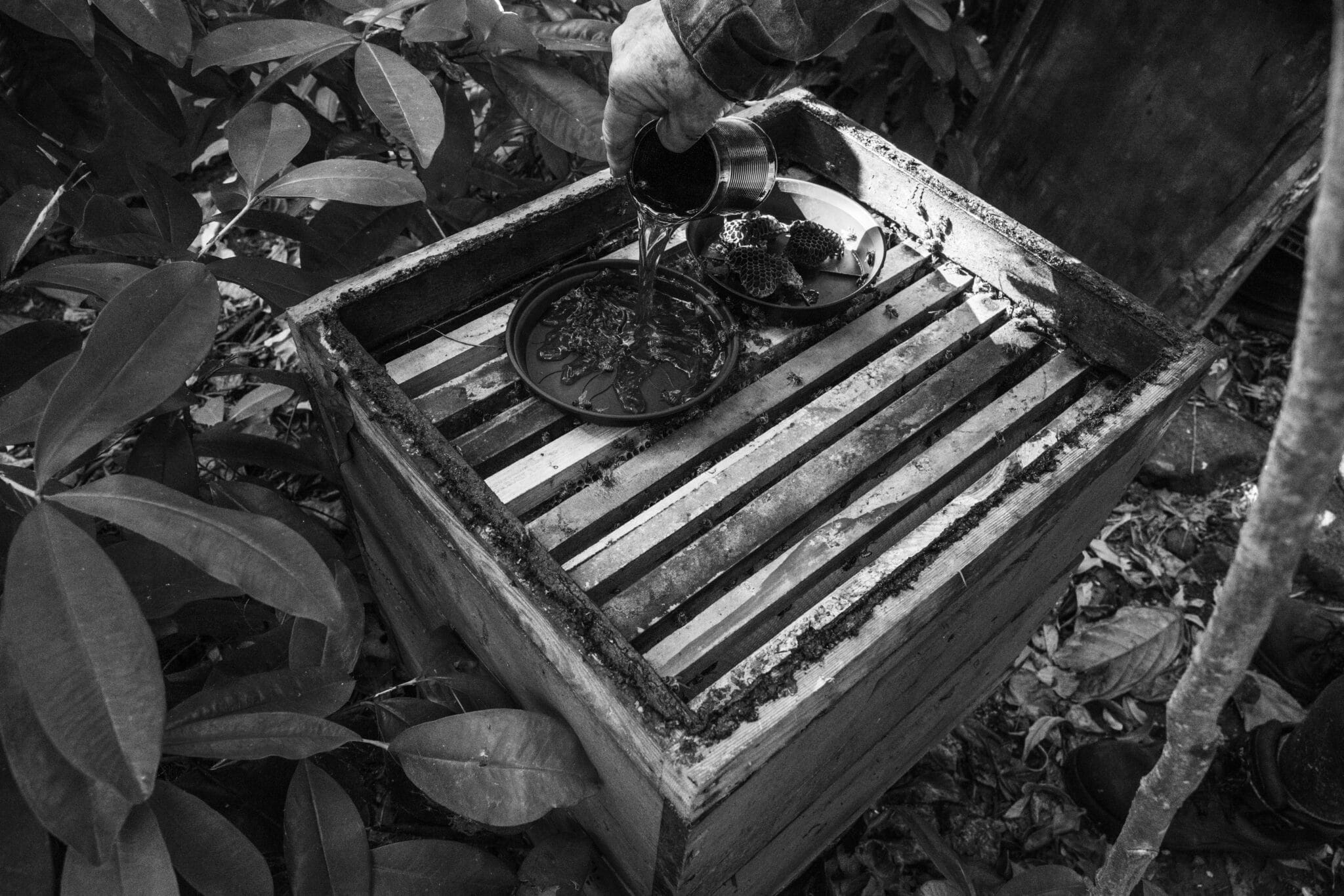 Montvert les hauts, 14/01/2025. Georget Ognard, apiculteur, debute sa journee dans son jardin ou se trouve ses ruches. Il verse du sirop, fait a partir de sucre non raffine et de vieux miel, dans les ruches pour nourrir les abeilles. A cause d’un manque de pluie et de fortes chaleurs, les abeilles ont besoin d’un surplus de sucre pour pouvoir produire du miel. Photographie par Olivier Ceccaldi/ Agence 43mm.Montvert les Hauts, 14/01/2025. Georget Ognard, apiculteur, aide ses abeilles a integrer la nouvelle ruche. Photographie par Olivier Ceccaldi/ Agence 43mm.Montvert les Hauts, 14/01/2025. Georget Ognard, apiculteur, debute sa journee dans son jardin ou se trouve ses ruches. Photographie par Olivier Ceccaldi/ Agence 43mm.