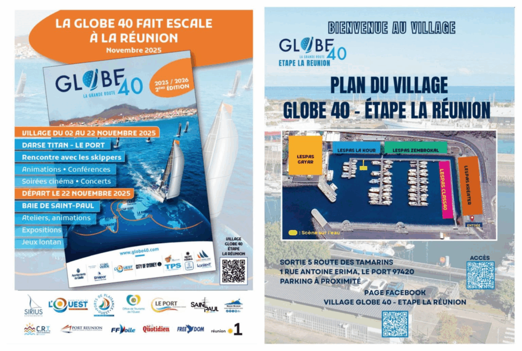 La course autour du monde GLOBE40 fait escale sur le Territoire de l’Ouest ! Du 5 au 22 novembre 2025, le Village GLOBE40 vous accueille à la Darse Titan – Le Port avec des animations gratuites tous les jours : rencontres avec les skippers, visites guidées, concerts, spectacles, cinéma en plein air, ateliers et marché Zartizan Péi.