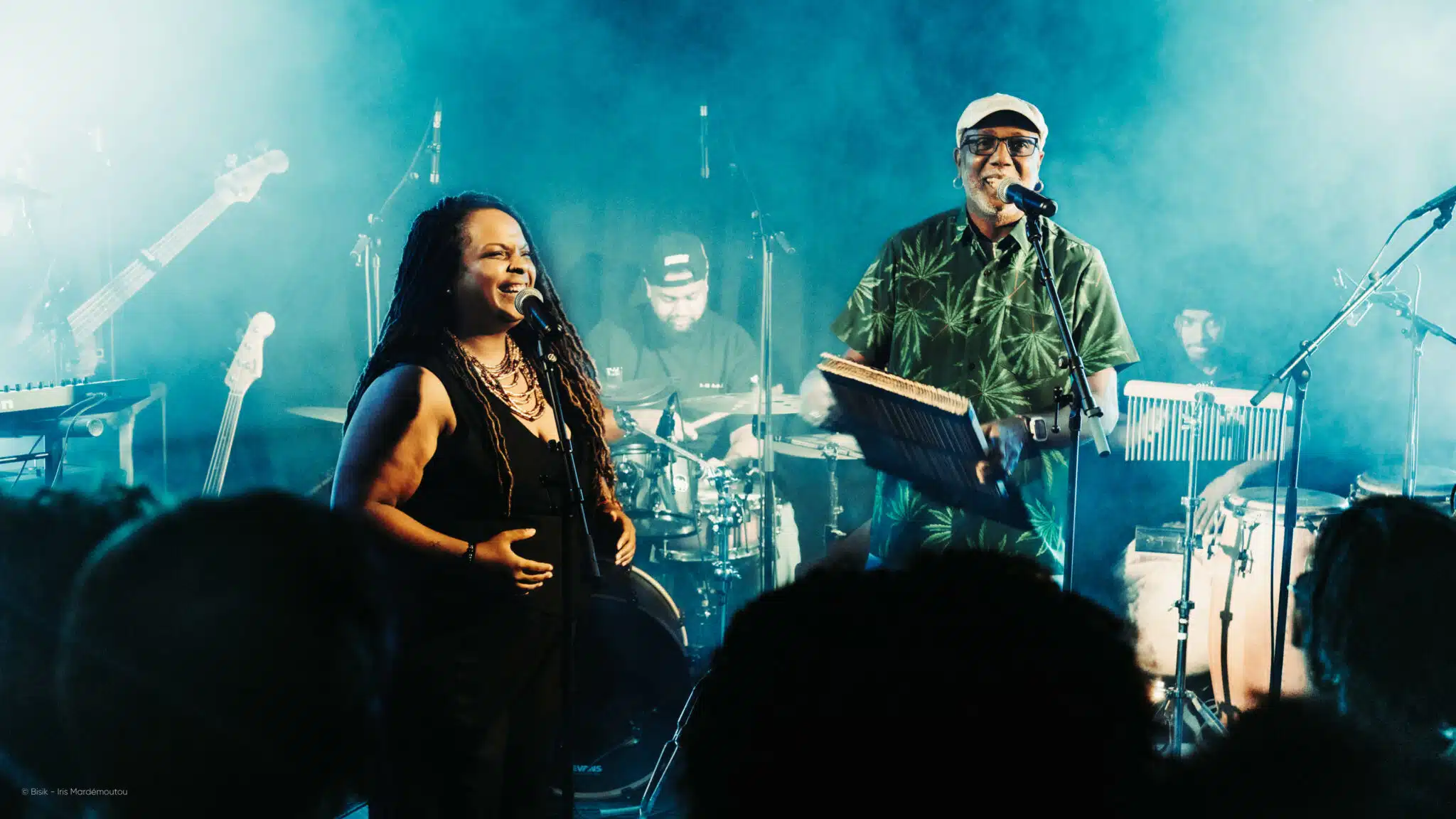 En duo avec Flora sur le titre “Flanm”, le public est suspendu à leurs lèvres, deux voix qui se répondent et se complètent mais aussi lors de l’intense duo avec “tonton” Tikok Vellaye.