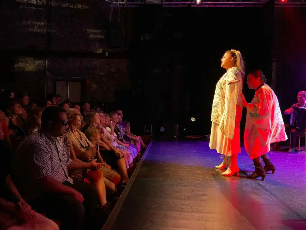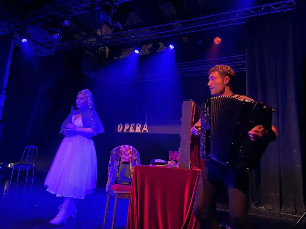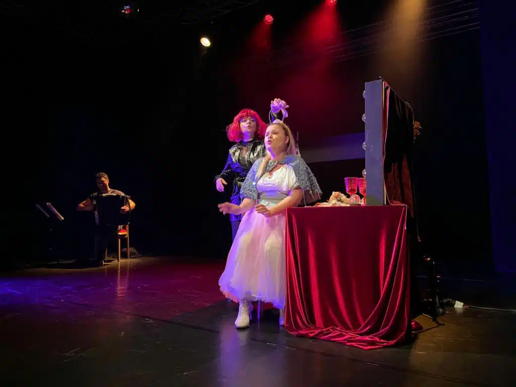 A l’affiche : Opérapiécé. Cet opéra foutraque et revendicatif interprète The chômeuses go on sur l’air de The show must go on de Queen. Aurore Bouston, en blanc, Marion Lépine, en noir, et Vincent Carenzi, à l’accordéon, enchantent la scène du lyrique à la variété française. Ils en sont à leur 180e représentation, c’est dire si le spectacle a plu aux critiques et aux publics qui en redemandent encore…