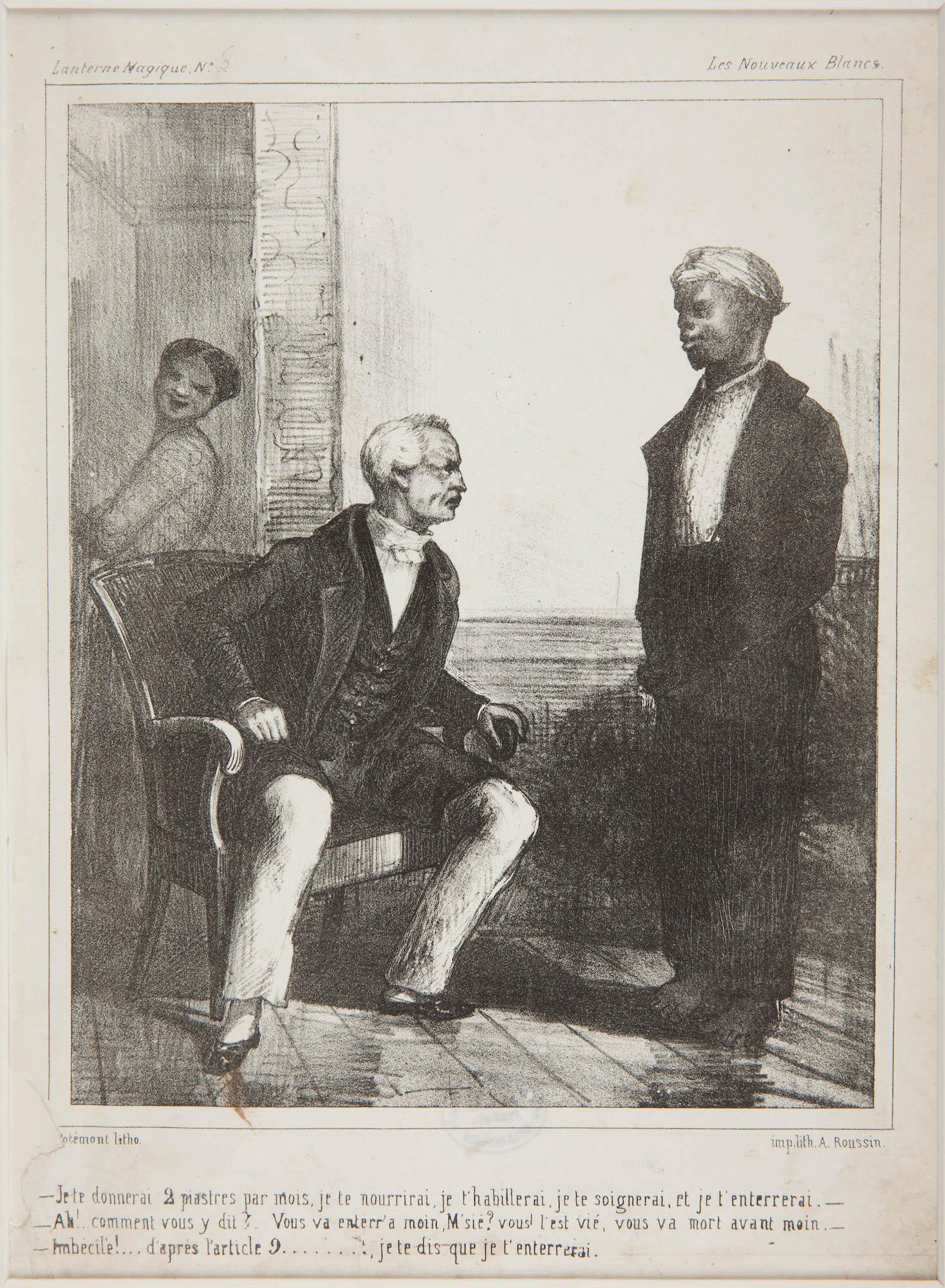 Il n’y a pas de planche pour le n°5. Passons au n°6 et c’est comique. L’esclavagiste devenu employeur détaille à son employé les termes du nouveau contrat. L’esclave libéré se montre moqueur envers son patron qui lui promet de se charger de son enterrement : « Vous va enterr’ a moin, M’sié ? vous l’est vié, vous va mort avant moin. ».