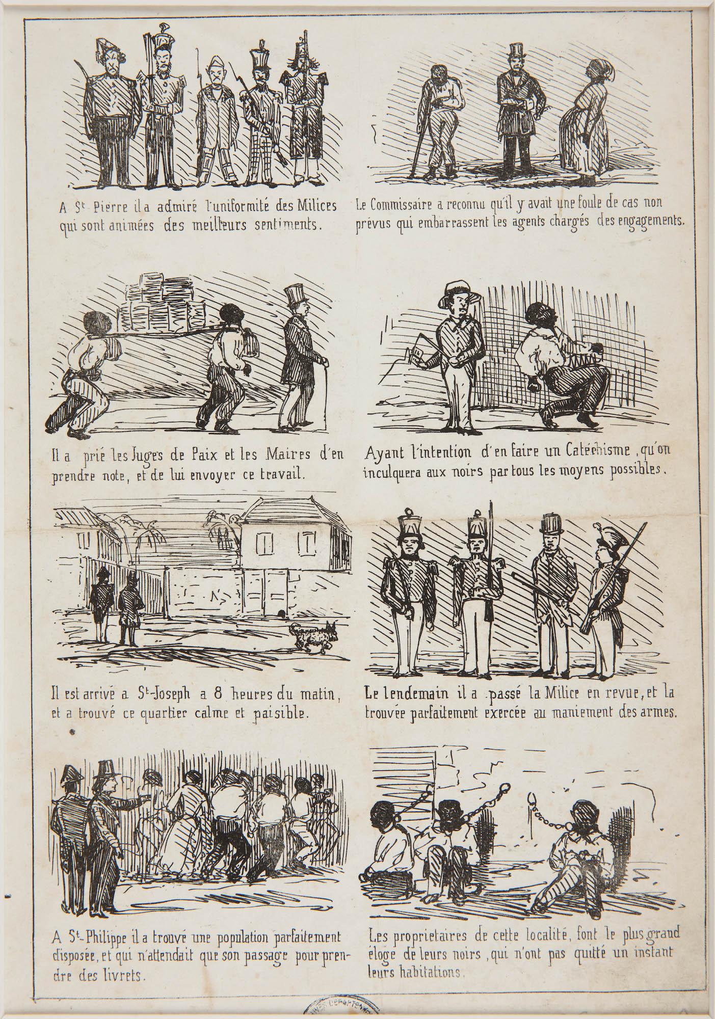 Il est donc difficile de trouver dans le siècle qui a suivi de telles publications satiriques aussi émancipées et inclassables. Les quinze planches sauvées de l’oubli révèlent une liberté de ton extraordinaire. Savoureuse. Chaque texte légendant les dessins de Potémont est teinté d’une cruelle ironie. Comme ces noirs « qui n’ont pas quitté leur habitation » alors qu’ils sont dessinés enchaînés, ces noirs appelés les « nouveaux blancs »… ou ces travaux illustrés par un coupeur de cannes en train de dormir.