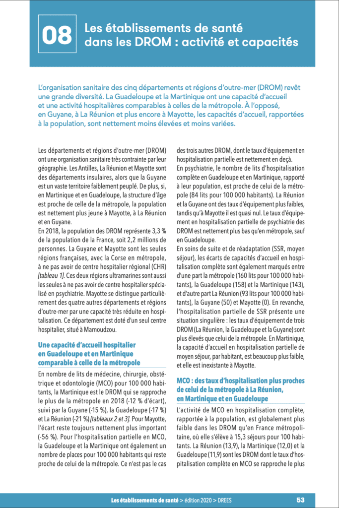 Pour illustrer cette inégalité elle prend l’exemple de l’ouest de La Réunion. L’hôpital public y compte 310 lits pour 220 000 habitants soit un ratio de 1,41 lit pour 1 000 habitants. Or, selon l’OCDE, la France compte environ 5,9 lits d’hôpitaux pour 1 000 habitants. « Si l’on appliquait le ratio national, la région ouest de La Réunion devrait disposer de plus de 1 300 places », souligne-t-elle. À titre de comparaison, le bassin de vie d’Aix-en-Provence, dont la population est comparable à celle de l’ouest de l’île, bénéficie d’environ 1 000 lits d’hôpitaux disponibles.
