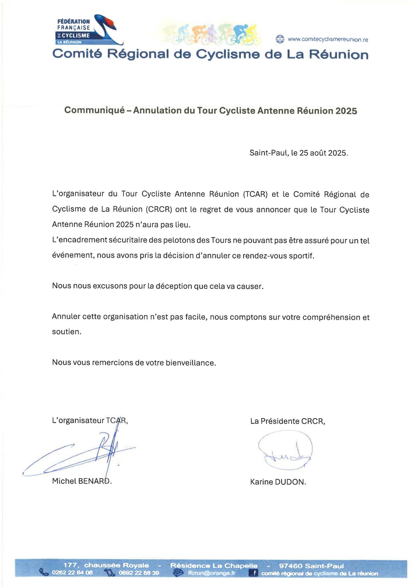 Communiqué du Comité Régional de Cyclisme de La Réunion annulant le TCAR