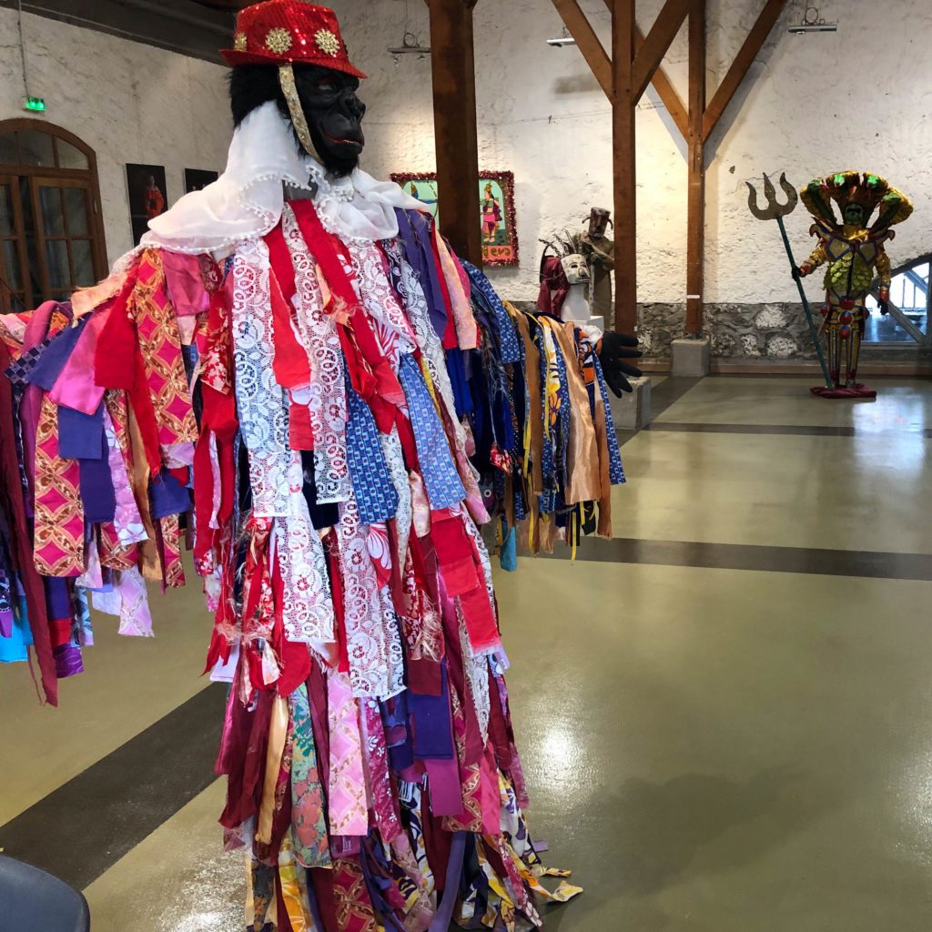 L’artiste avait déjà montré une partie de ce travail lors d’expositions précédentes, notamment celle présentée en 2017 à la chapelle des Carmélites lors du festival Rio Loco à Toulouse. Y trônait la figure majestueuse d’un mardigra déguisé et masqué, aux cornes de cerf, côtoyant un autel aux esprits, un oratoire St Expédit, ainsi qu’un chien « Royal Bourbon » habillé et se balançant au bout d’une corde.