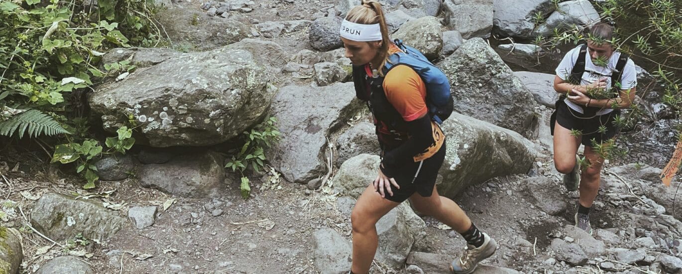 Début du sentier Taïbit 10h45 / La vie aime se jouer de nous, alors par le hasard des choses, elle m’emmène une coéquipière. Pauline vient me voir au ravito : « Ce n’est pas toi que j’ai croisée il y a deux semaines sur le Cap Anglais ? » Si, c’était moi. Son rythme est plus élevé que le mien. Je le prends comme un signe de la vie, elle va m’aider, me porter. On monte le Taïbit ensemble, mais je la pousse à aller à son rythme.