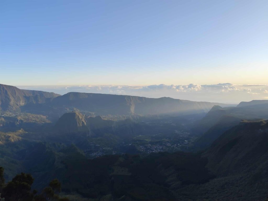 Les sentiers surplombent Cilaos, et l’on devine l’église, le stade, les ruelles où l’on a déambulé des dizaines de fois auparavant. Qu’est-ce que j’aime ce cirque, et ces chemins qui mènent à Roche Merveilleuse. J’adore ce que je suis en train de vivre, en pleine nature, sous une météo parfaite, qui me fait dire encore une fois : j’ai de la chance d’être là.