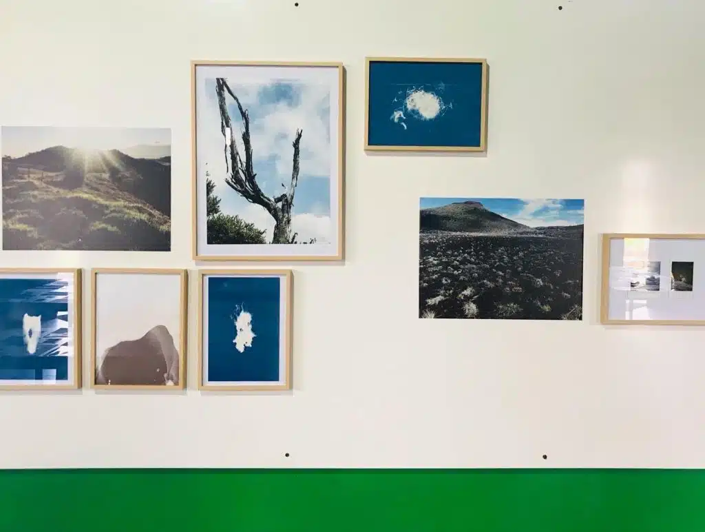 Au domaine des Tourelles, elle nous propose des dialogues formels entre cyanotypes, photographies et polaroids, auxquels elle convoque des collages réalisés à partir de cartes IGN, présentés sous verre et posés sur de grands supports blancs, dans une composition archipellique.