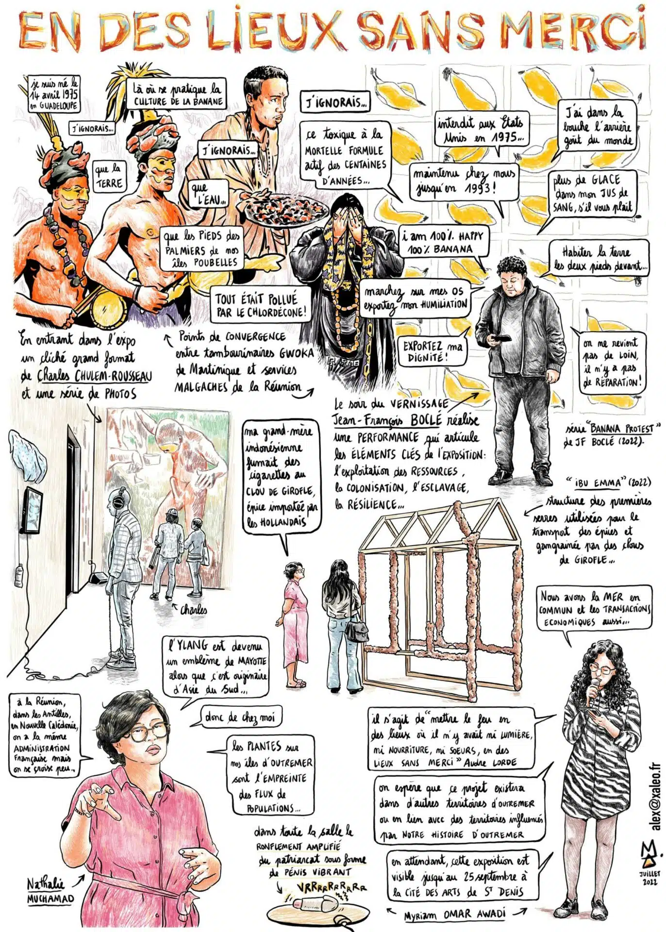 Visible jusqu’au 25 septembre à la Cité des arts, l’exposition « En des lieux sans merci », qui regroupe les oeuvres de Jean-François Boclé, Charles Chulem Rousseau, Nathalie Muchamad & Myriam Omar Awadi, a inspiré le journaliste dessinateur Alex M.