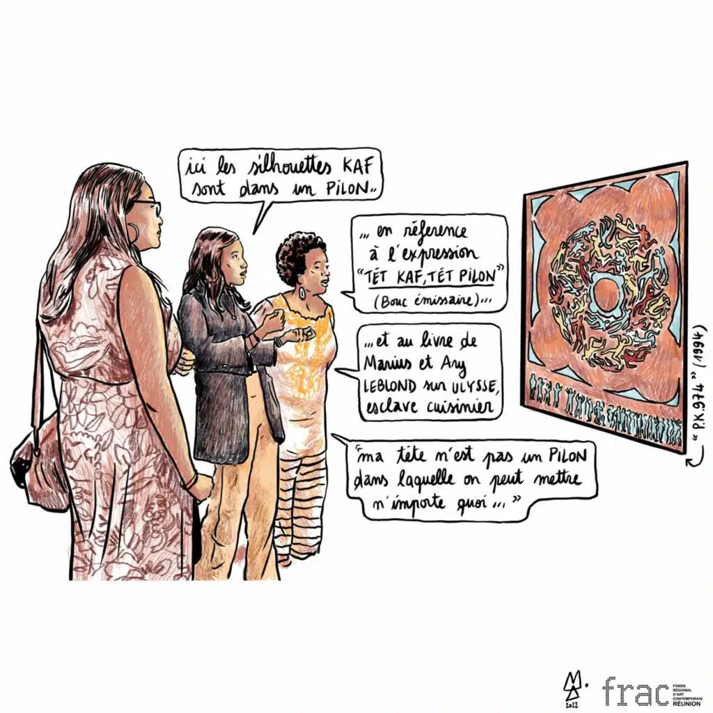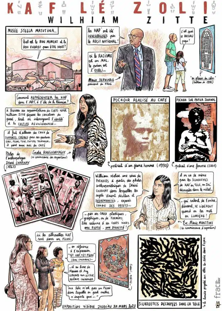Cette semaine, Parallèle Sud accueille un nouveau reportage en bande dessinée d’Alex M. Un bonheur ! Le journaliste dessinateur voyage entre les toiles du regretté Wilhiam Zitte. L’expo « Kaf lé zoli » est ouverte au public jusqu’au 31 mars au musée de Stella Matutina. Il y est question de la figure de l’homme noir dans la société bourbonnaise puis réunionnaise. Une œuvre contre le racisme et l’oubli. Lors de notre première visite de cette superbe exposition, nous y avions repéré la première bédé de La Réunion. Alex M. livre une nouvelle planche. Hâte de découvrir la suite…