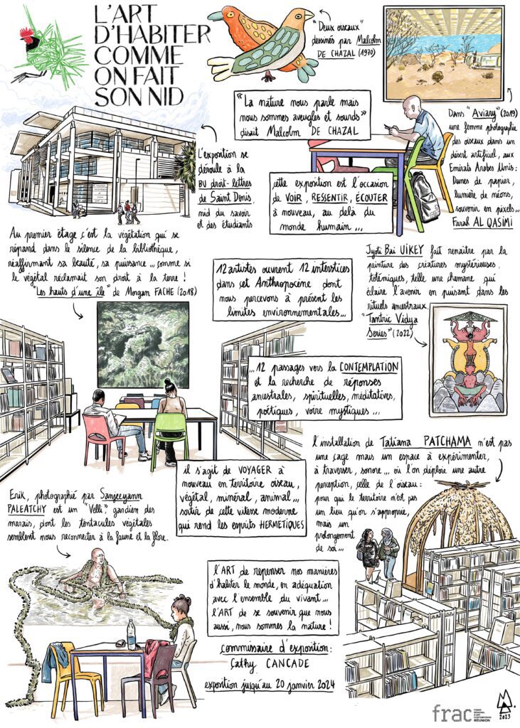 Cette semaine, Alex M propose un reportage dessiné sur l’exposition « L’art d’habiter comme on fait son nid » : soit la capacité à réduire ce phénomène de séparation et de domination entre l’homme et la nature.